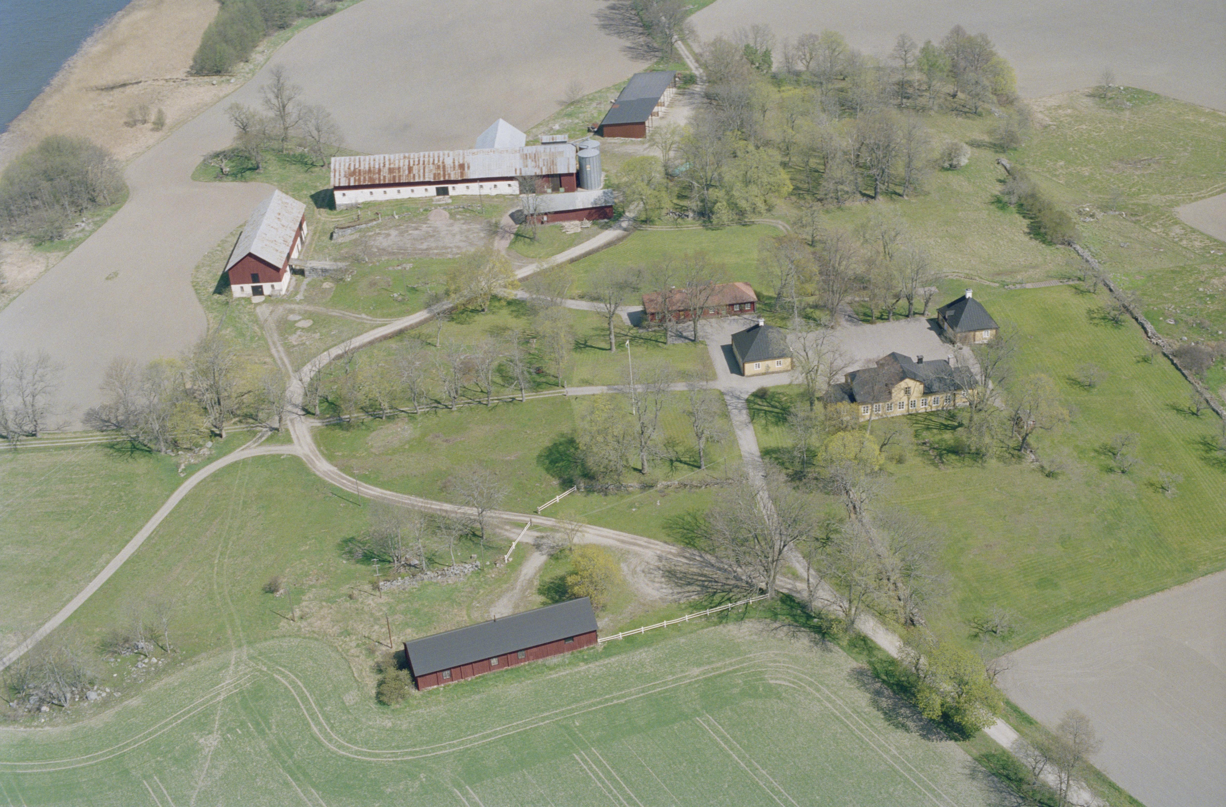 Beskrivning: Uppe till vänster skymtas Ängsösund i Mälaren mellan Oxfjärden i öster och Kungsårafjärden i väster. Kuröns herrgård i storgårdstomt RAÄnr Ängsö 157. Bilden är tagen mot (väderstreck): NNO