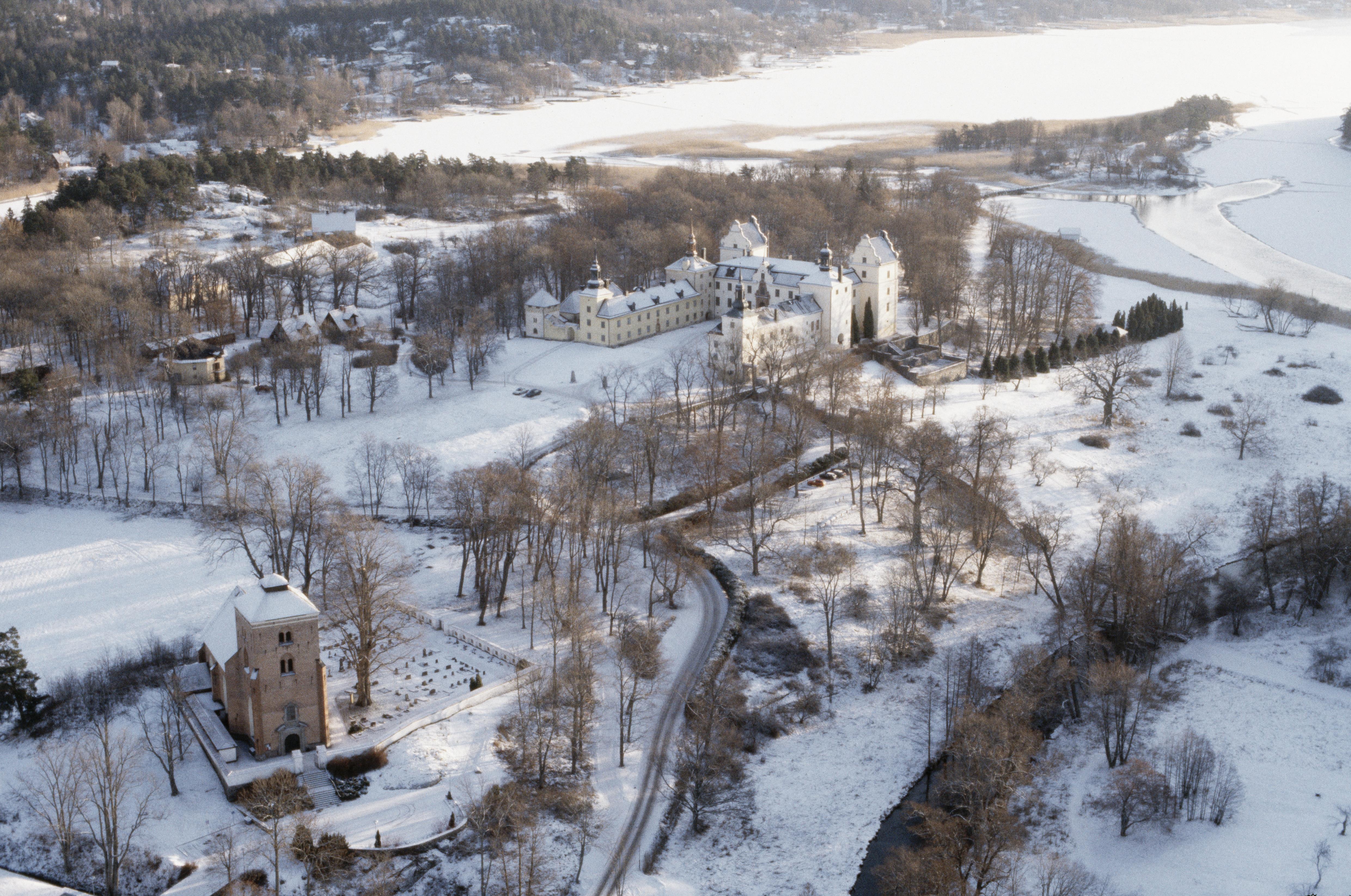 Beskrivning: Tyresö kyrka och Tyresö slott (byggnadsminne RAÄnr Tyresö 37:1) vid Kalvfjärden. Bilden är tagen mot (väderstreck): Ö