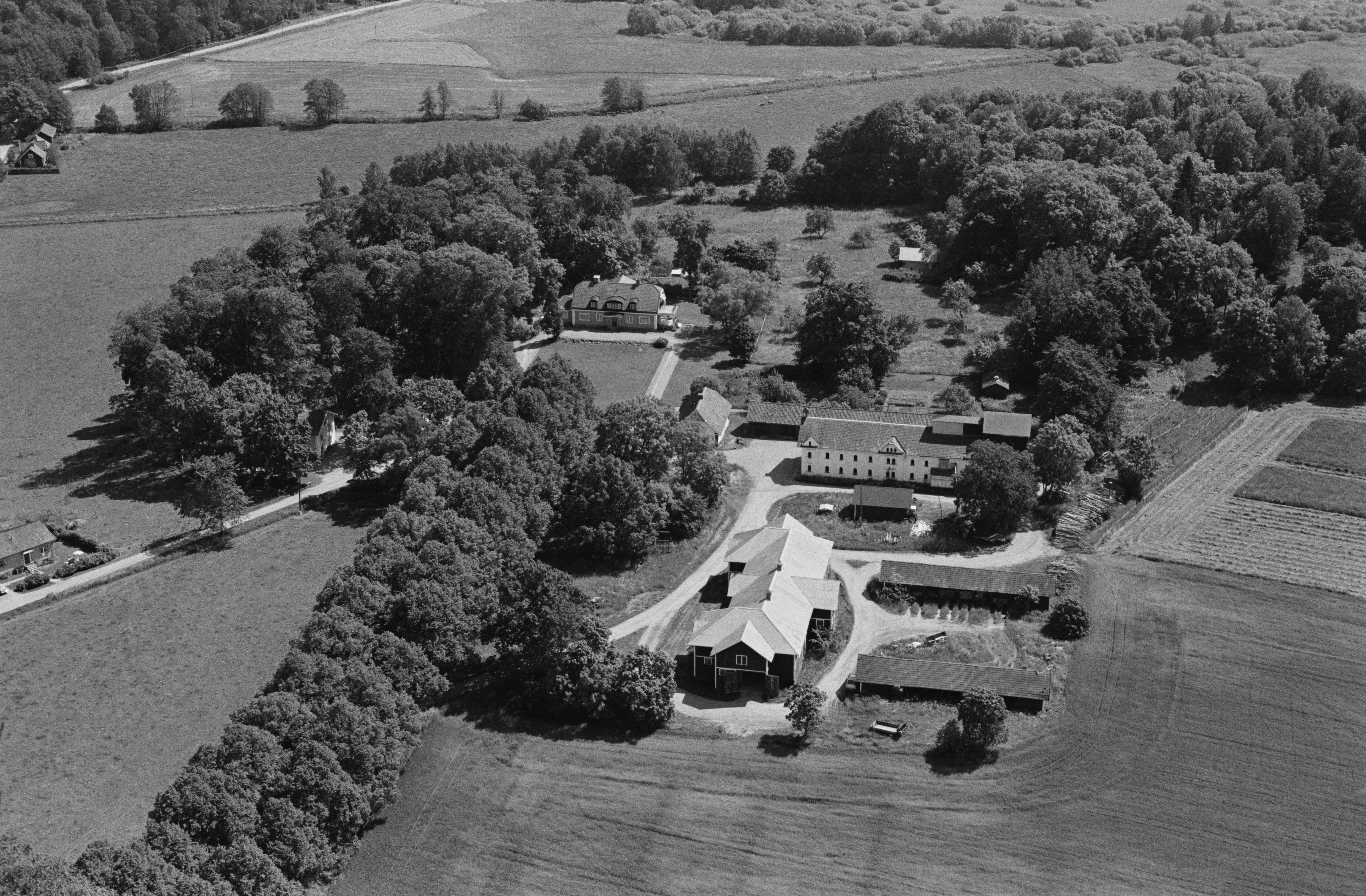 Beskrivning: Hjortsberga herrgård / säteri. Uppe till höger gravfält RAÄnr Vårdinge 60:1. Bilden är tagen mot (väderstreck): SO