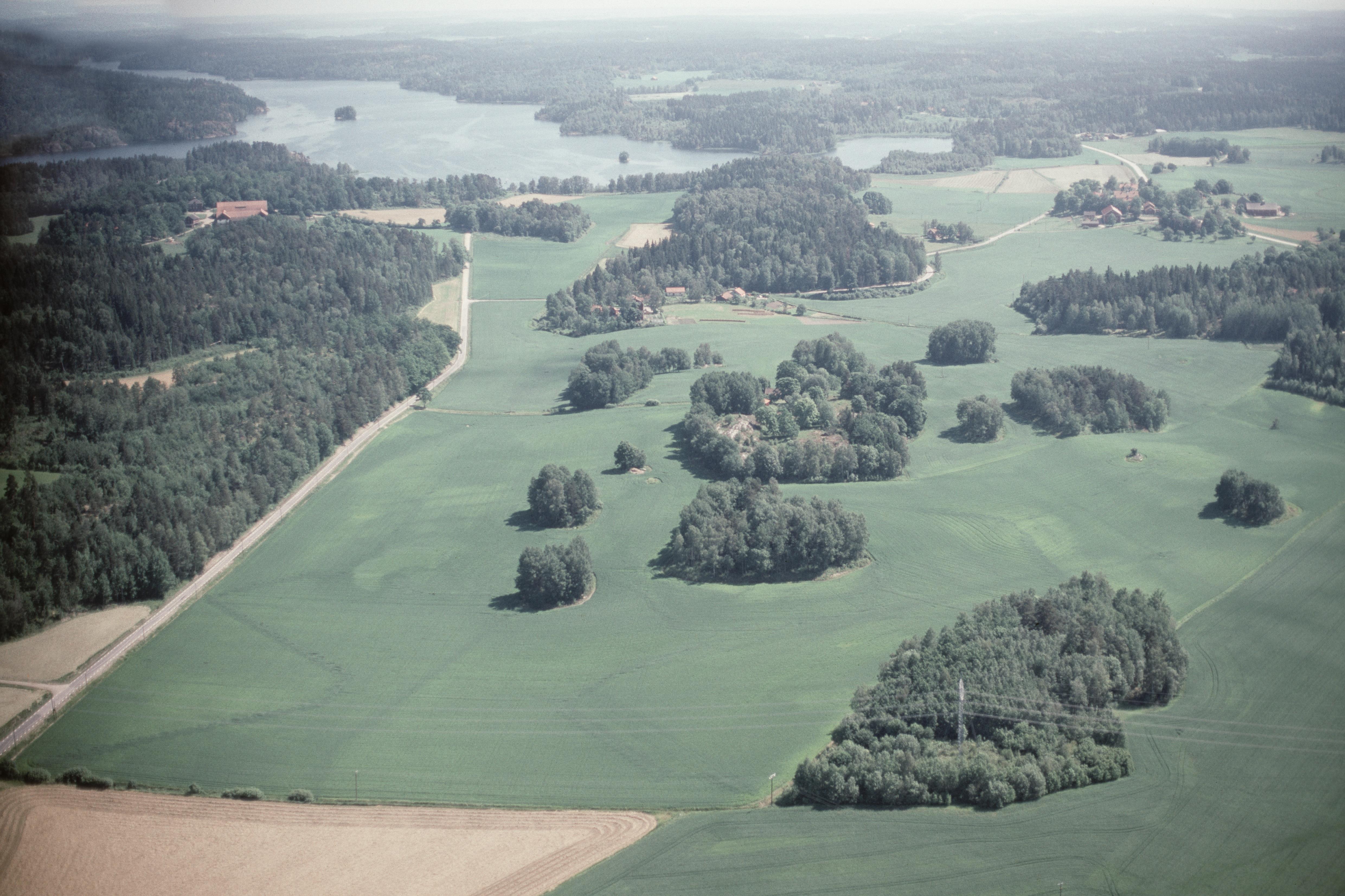 Beskrivning: Vid bildens mitt Skarberga gård och boplats RAÄnr Vårdinge 252:1. Uppe till vänster herrgården Nådhammar vid Långsjön. Bilden är tagen mot (väderstreck): OSO