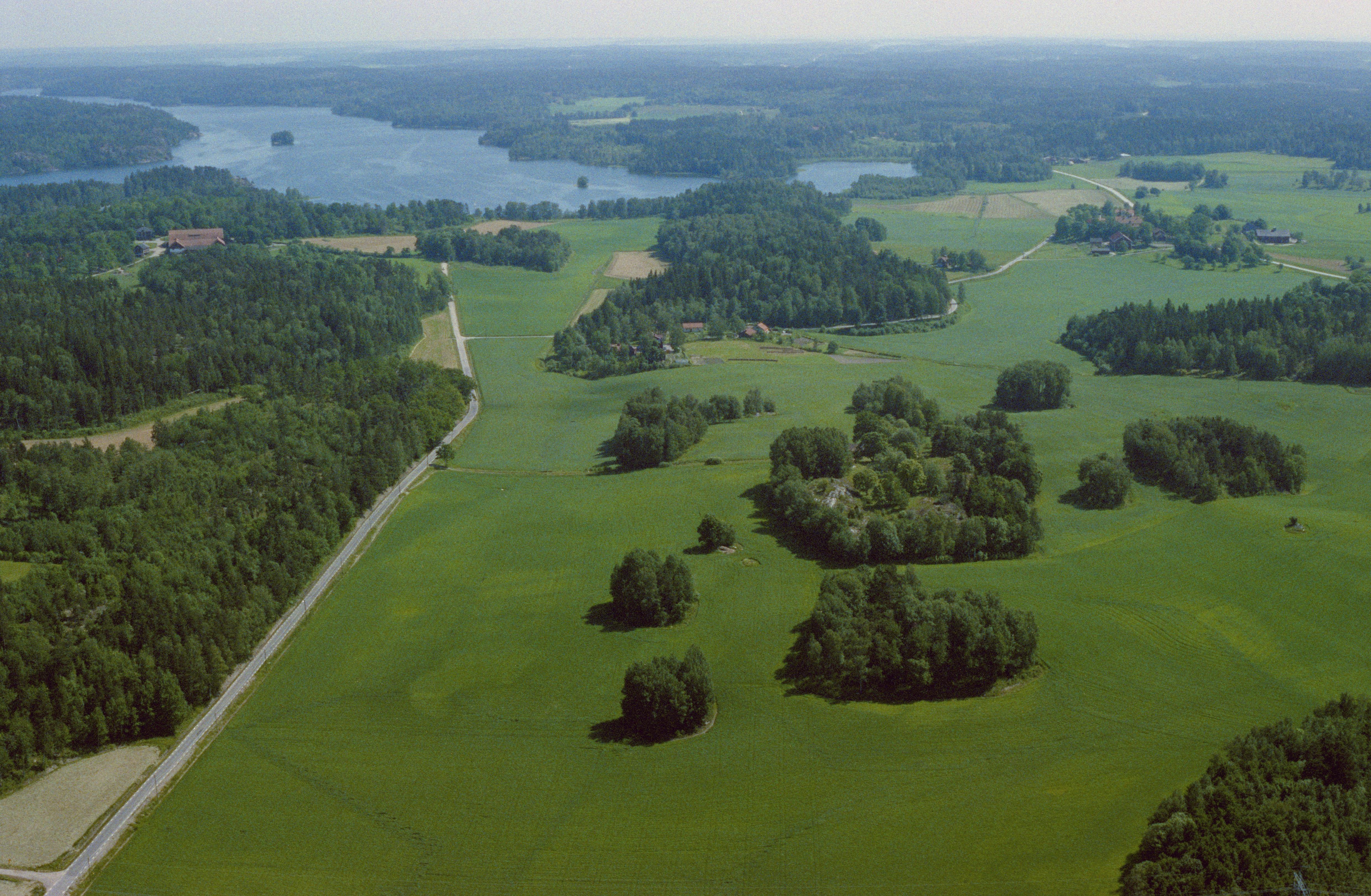 Beskrivning: Vid bildens mitt Skarberga gård och boplats RAÄnr Vårdinge 252:1. Uppe till vänster herrgården Nådhammar vid Långsjön. Bilden är tagen mot (väderstreck): OSO