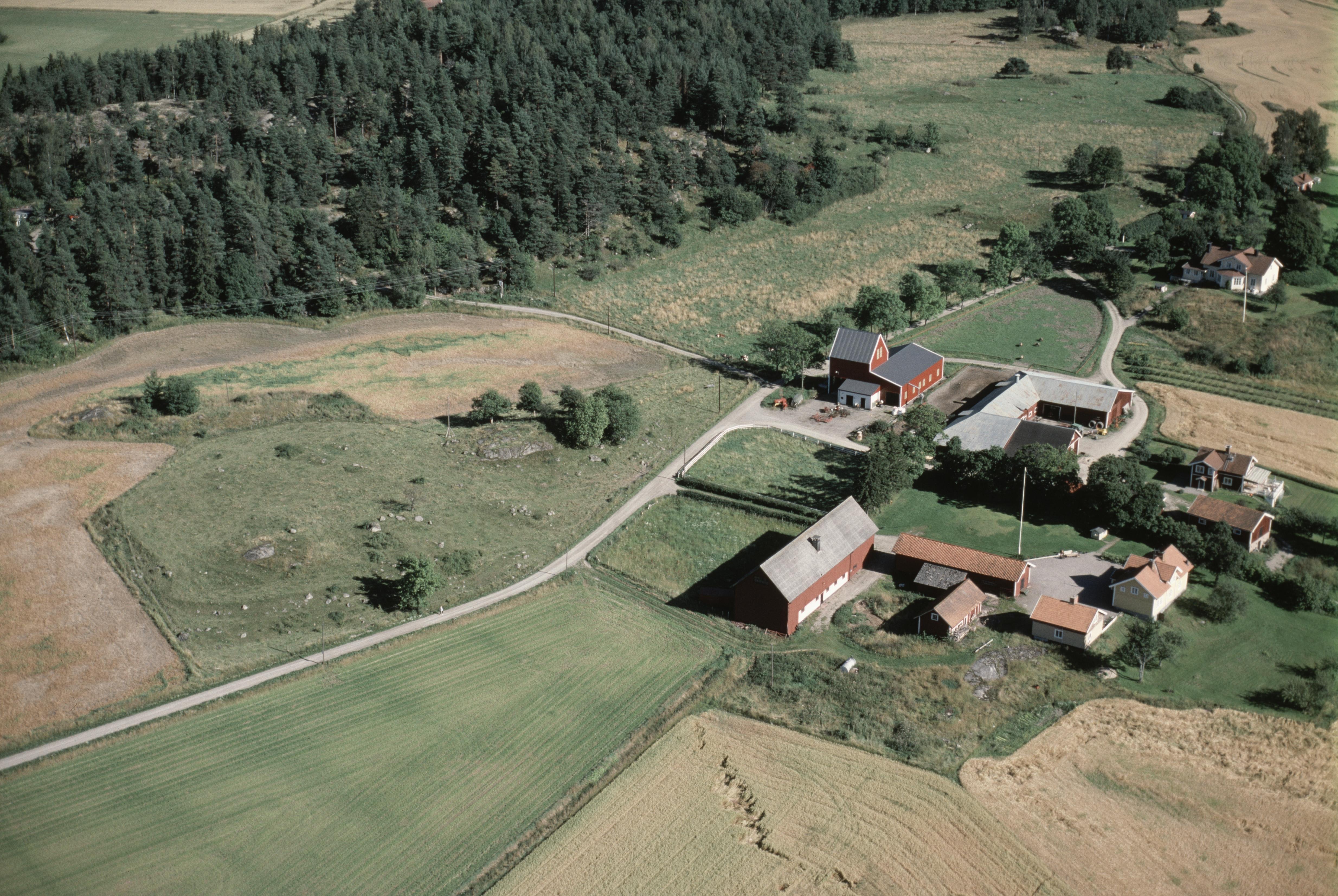 Beskrivning: Stene by. Gårdarna Mellan-Stene och Södra Stene. Till vänster hällristningshällar RAÄnr Vårdinge 92:1, 93:1, 94:1 m.fl. Bilden är tagen mot (väderstreck): OSO