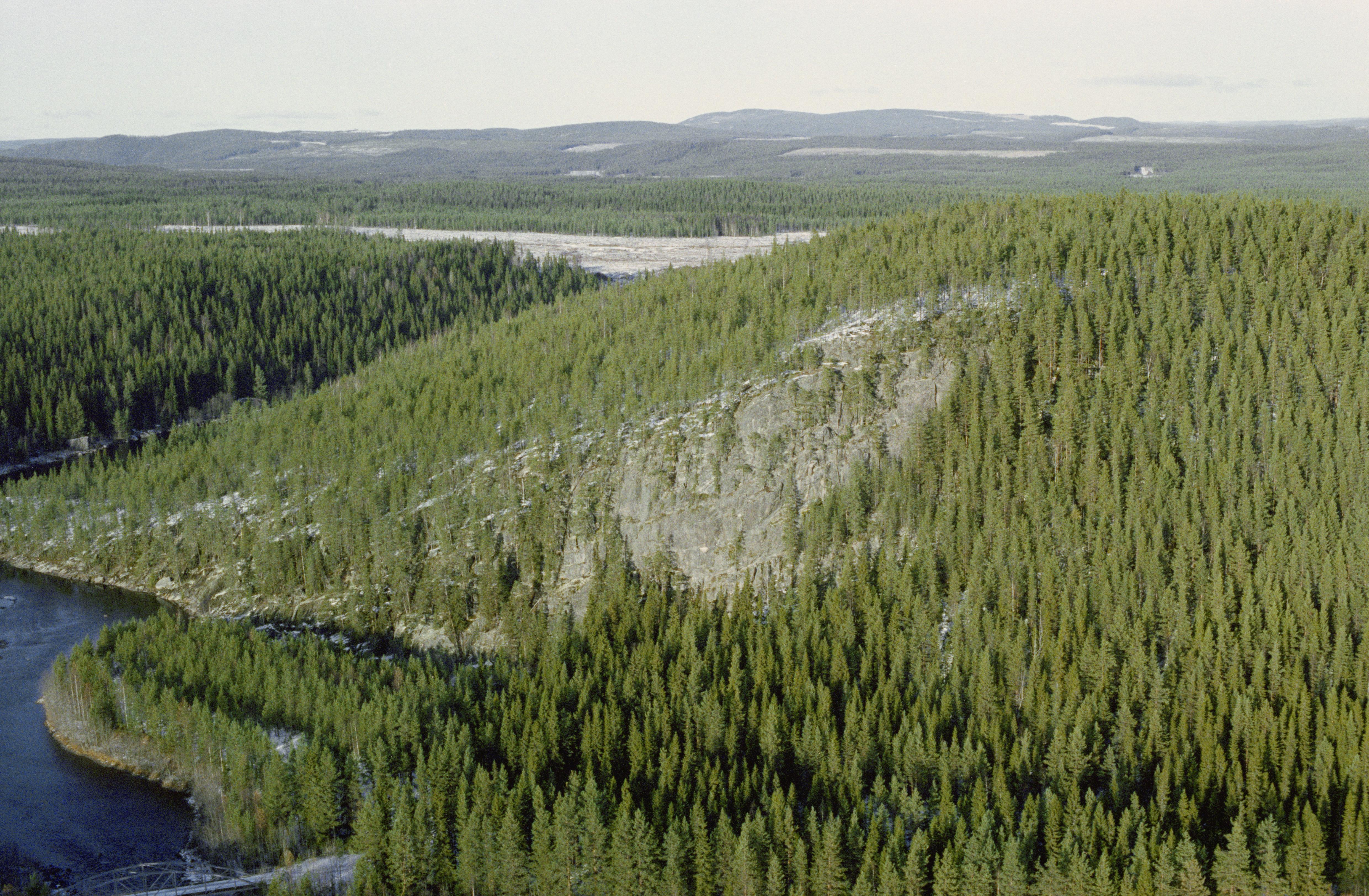 Beskrivning: Brattforsberget vid Storån, Malmån och Vängelälven. I bergsidan vid bildens mitt hällmålningar RAÄnr Fjällsjö 191:1. Bilden är tagen mot (väderstreck): N