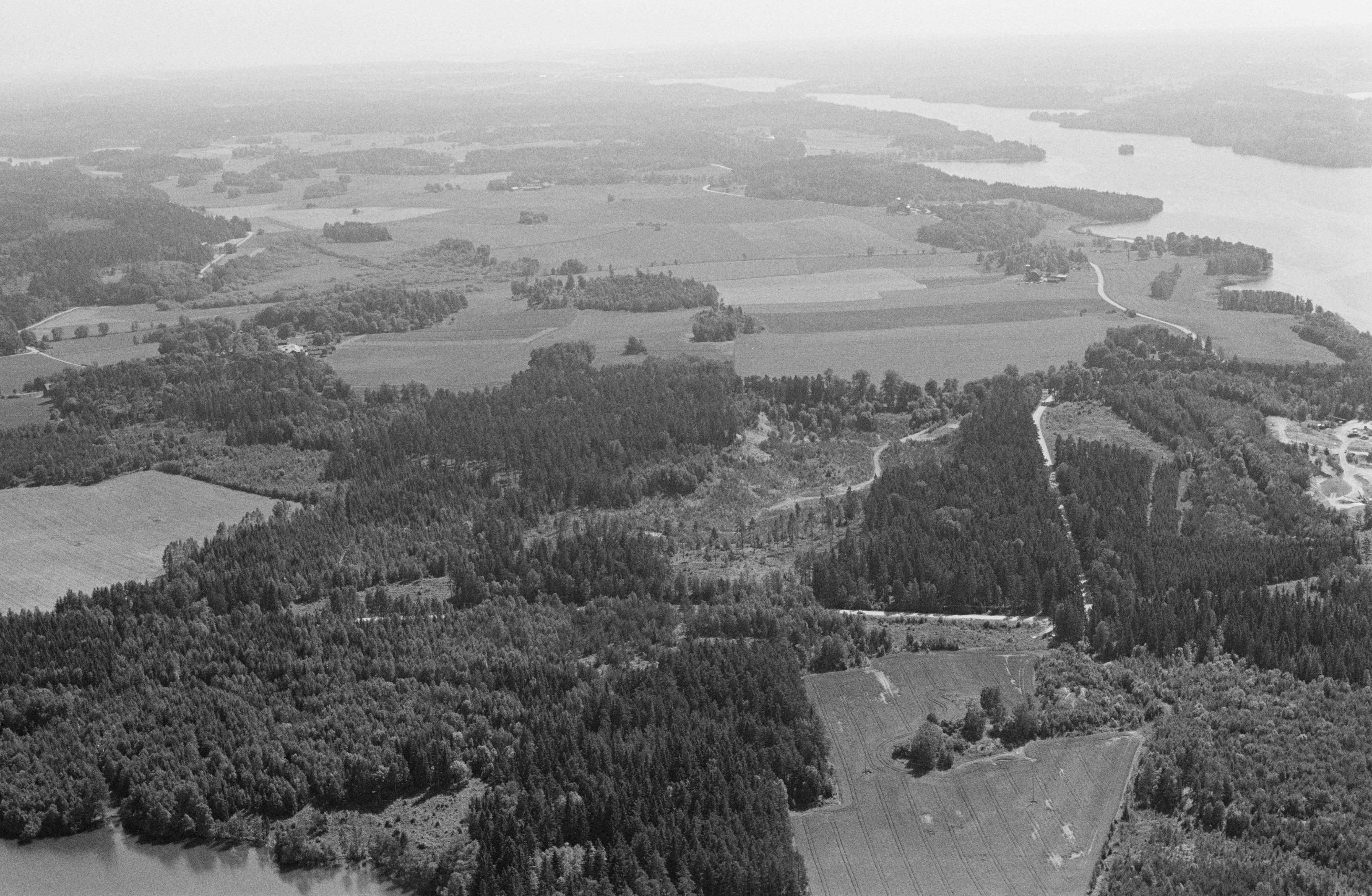 Beskrivning: Nere till vänster Skillötsjön och Sjumarkaland norrost om kyrkan. Gravfält RAÄnr Vårdinge 12:1, 13:1 m.fl. vid bildens mitt. Sjön Sillen uppe till höger. Bilden är tagen mot (väderstreck): SV