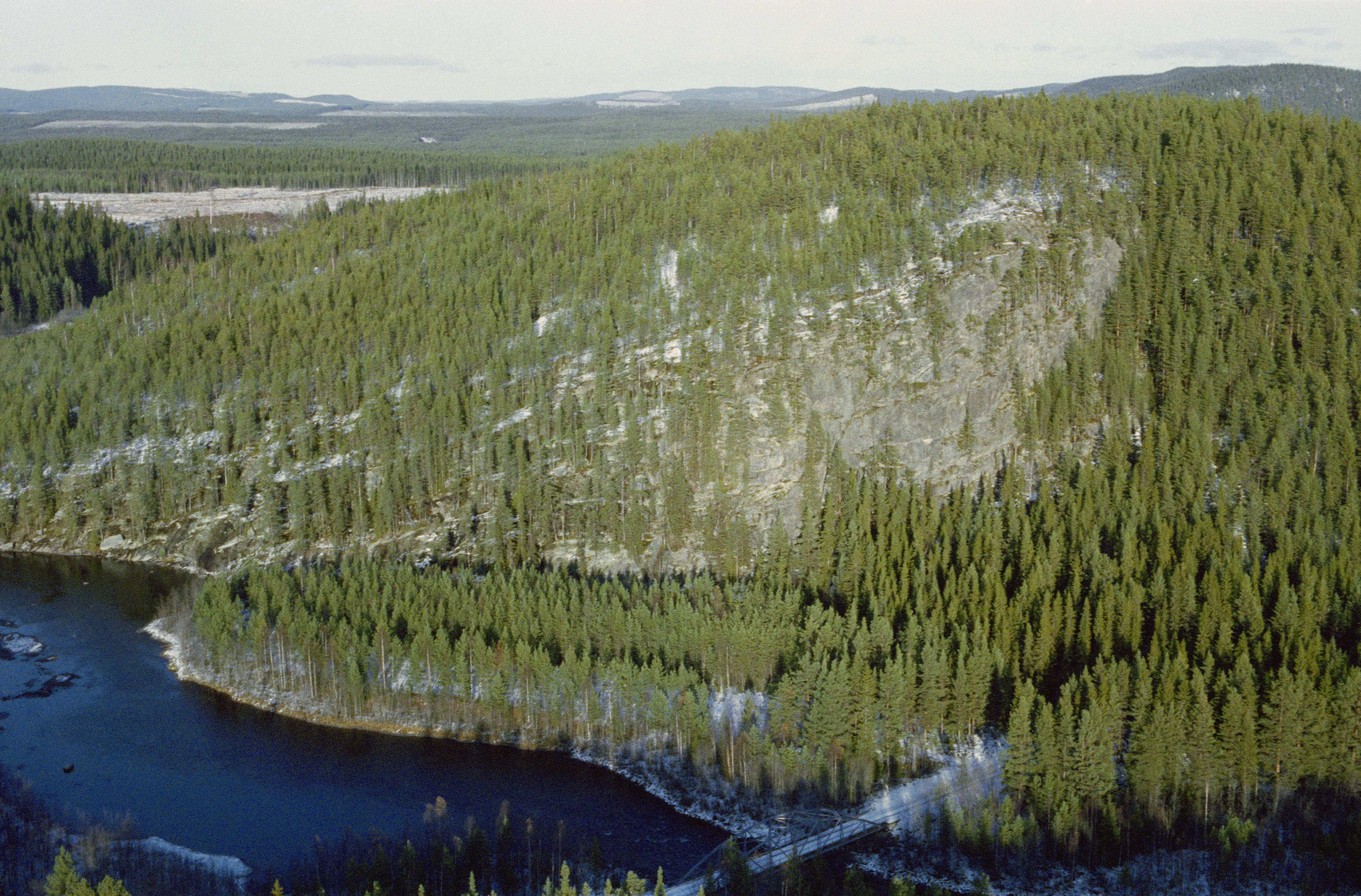 Beskrivning: Brattforsberget vid Storån, Malmån och Vängelälven. I bergsidan vid bildens mitt hällmålningar RAÄnr Fjällsjö 191:1. Bilden är tagen mot (väderstreck): NNO