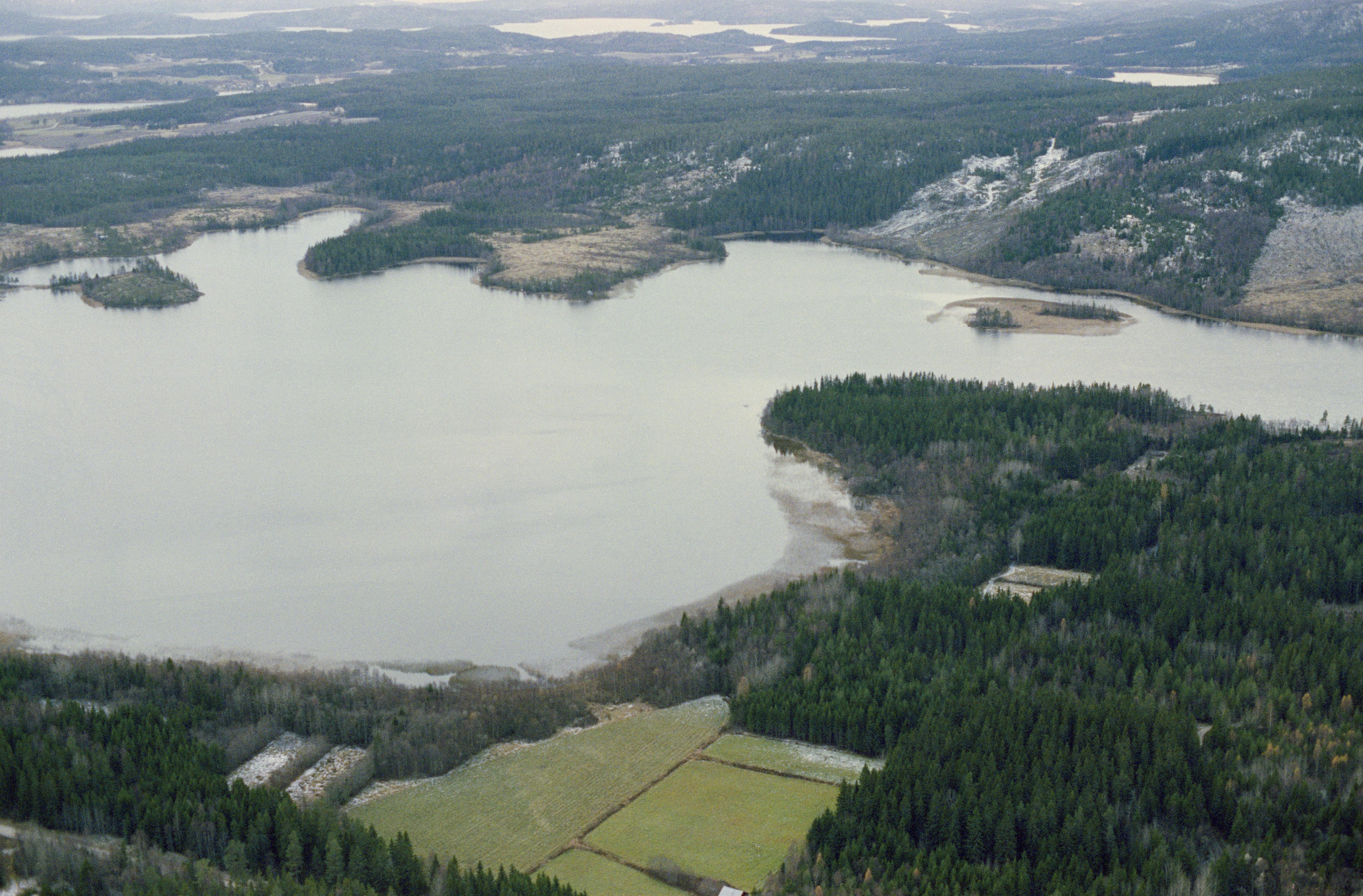 Beskrivning: Höga kustens världsarvområde. Uppe till vänster Lappnäset i Storsjön med boplats, gravplats och fossil åker RAÄnr Nora 5:1-3, 6:1-2 m.fl. I bildens övre del sjön Norasundet. Nere till höger Långudden söder om Gallsätter vid gränsen till socknet Skog (i bildens nedre kant). Bilden är tagen mot (väderstreck): S