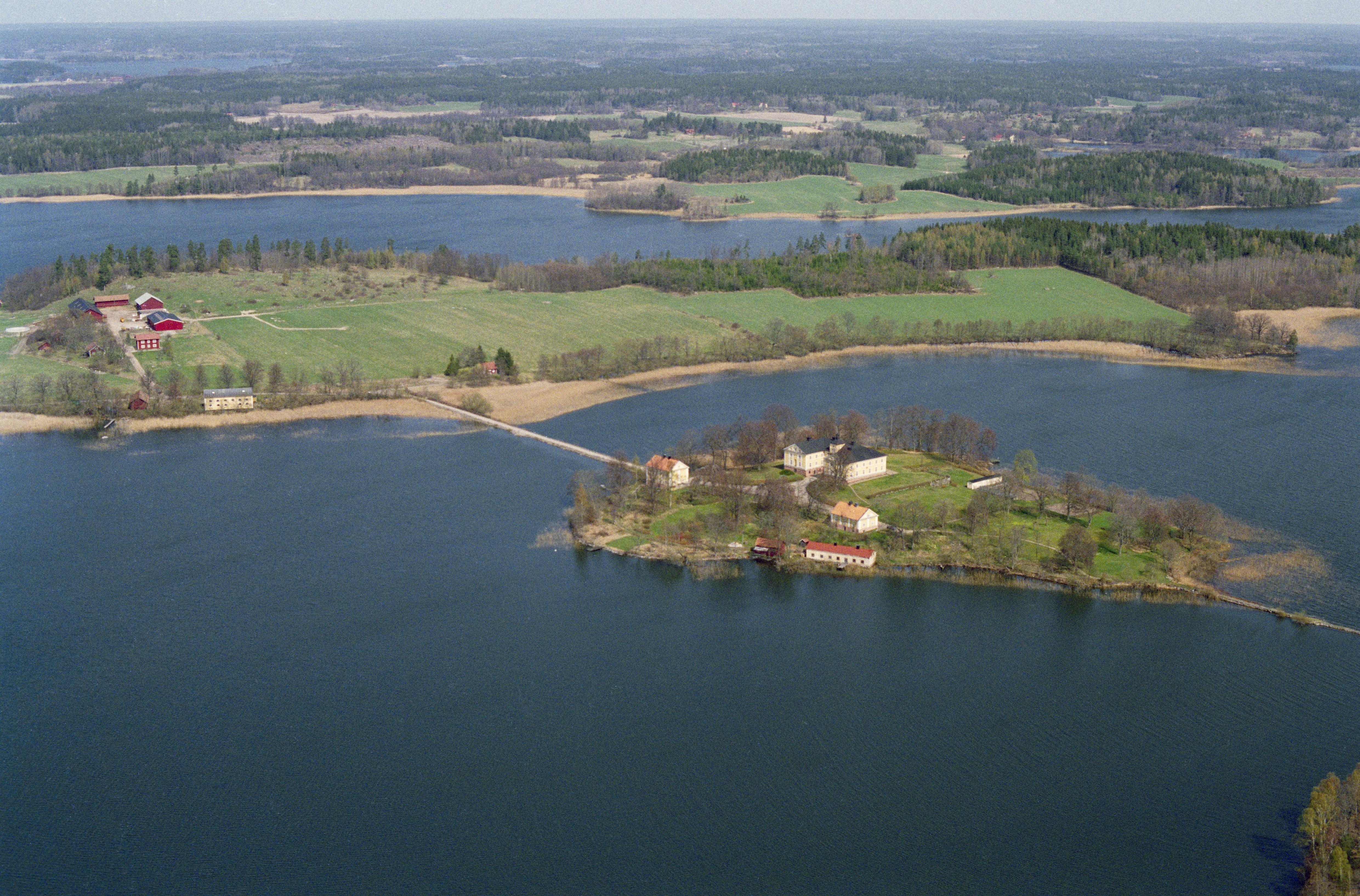 Beskrivning: Till höger Vibyholms slott RAÄnr Årdala 123:1 vid sjön Båven. Bilden är tagen mot (väderstreck): N
