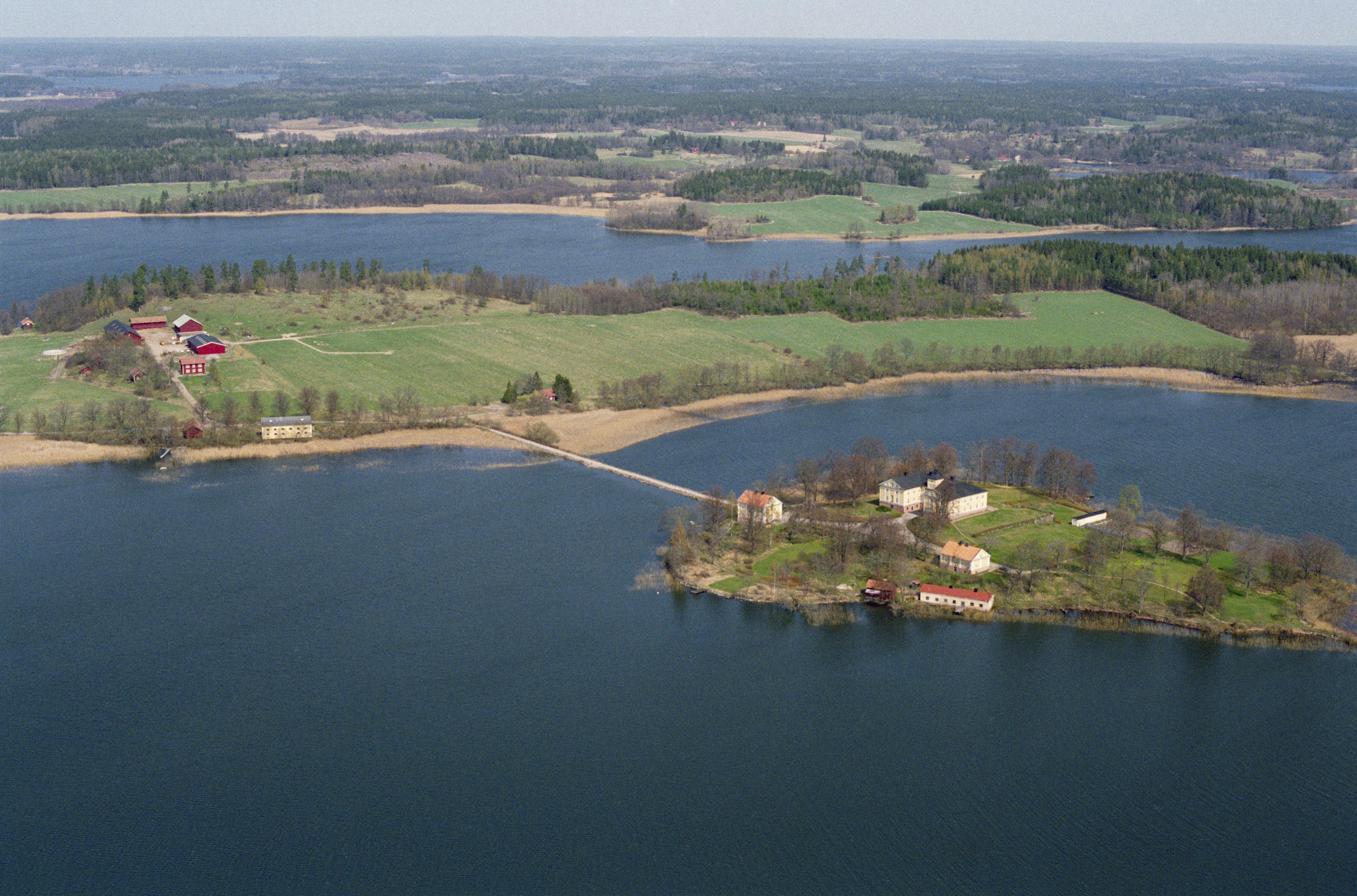 Beskrivning: Till höger Vibyholms slott RAÄnr Årdala 123:1 vid sjön Båven. Bilden är tagen mot (väderstreck): N