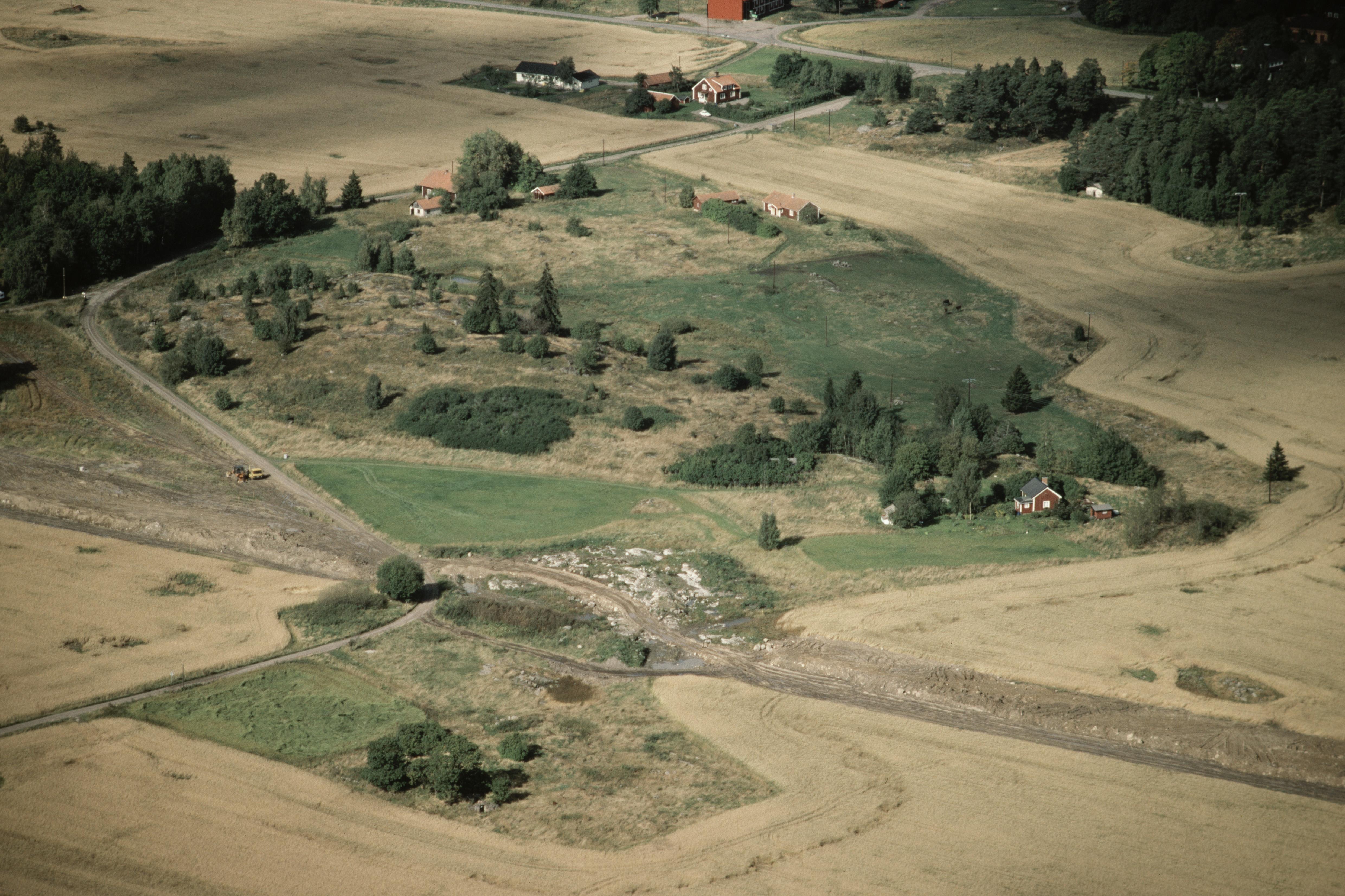 Beskrivning: Arkeologiska undersökningar innan bygge av väg E18 vid Apalle, Högsta och Pollista. Vid bildens mitt gravfält Dragonbacken RAÄnr Övergran 9:1 m.fl. och Pollista gamla tomt Övergran 228:1. Bilden är tagen mot (väderstreck): NV