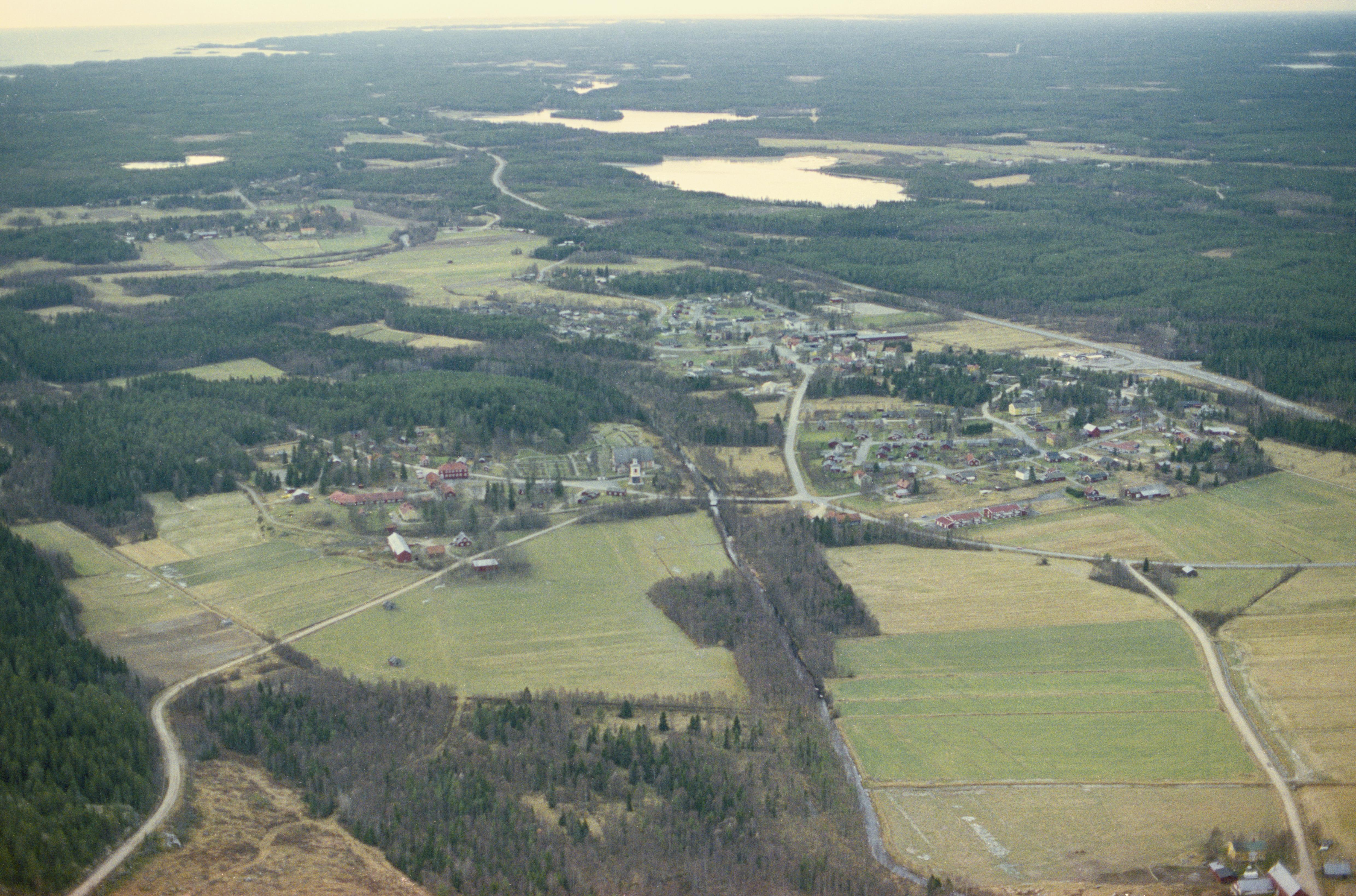Beskrivning: Bygdeå kyrka i Storbäckens dalgång. Bygdeå kyrka vid bildens mitt. Vid kyrkan minnesmärke RAÄnr Bygdeå 23:1. I bildens övre del sjöarna Ängessjön och Åsjön. Bilden är tagen mot (väderstreck): S