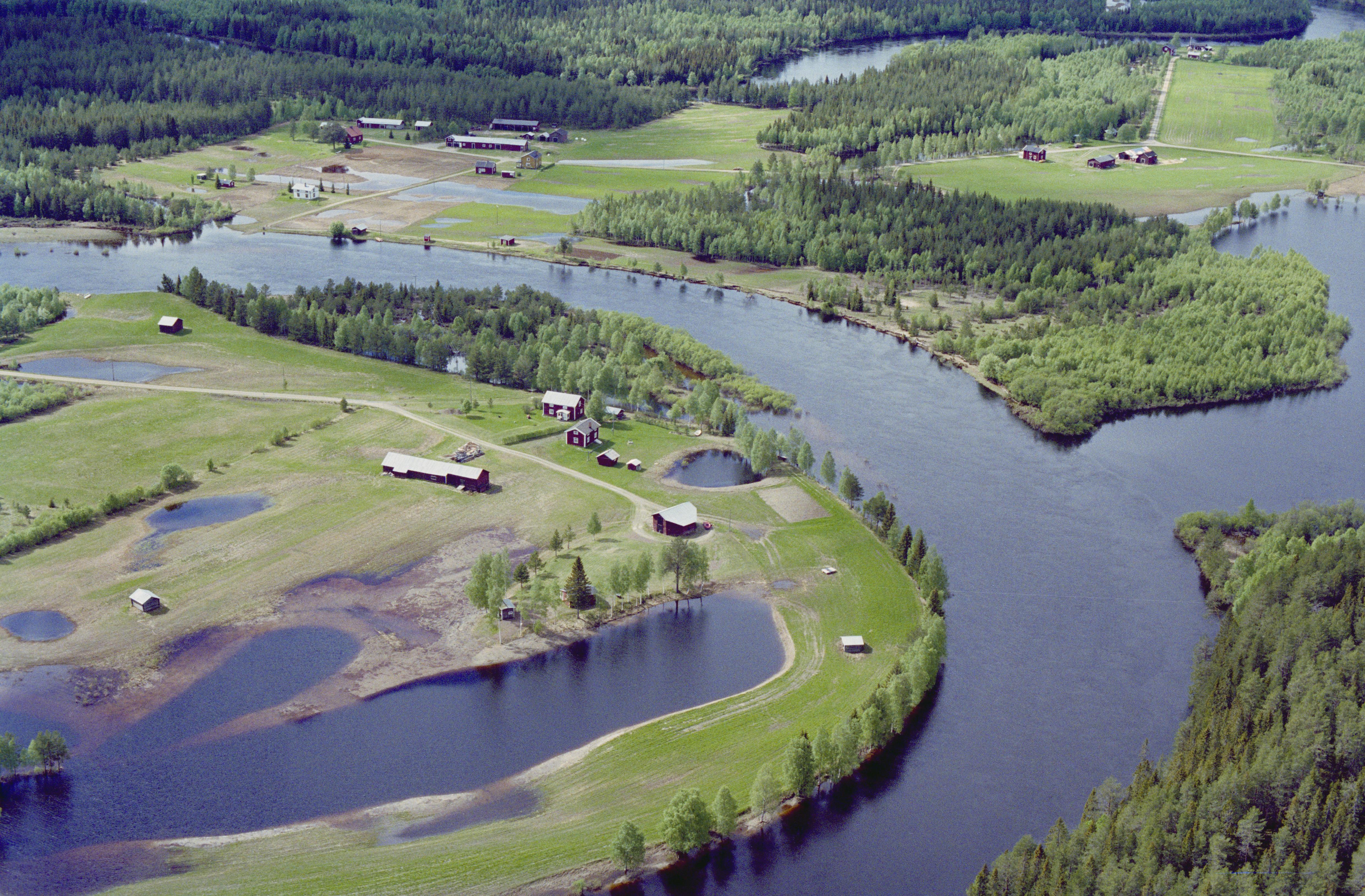 Beskrivning: Byskeälven vid Holmstrand. Gården Jon-Pers till vänster vid tjärnen Svartåviken. Till höger om bildens mitt Sakristiudden vid Storviken. Bilden är tagen mot (väderstreck): V