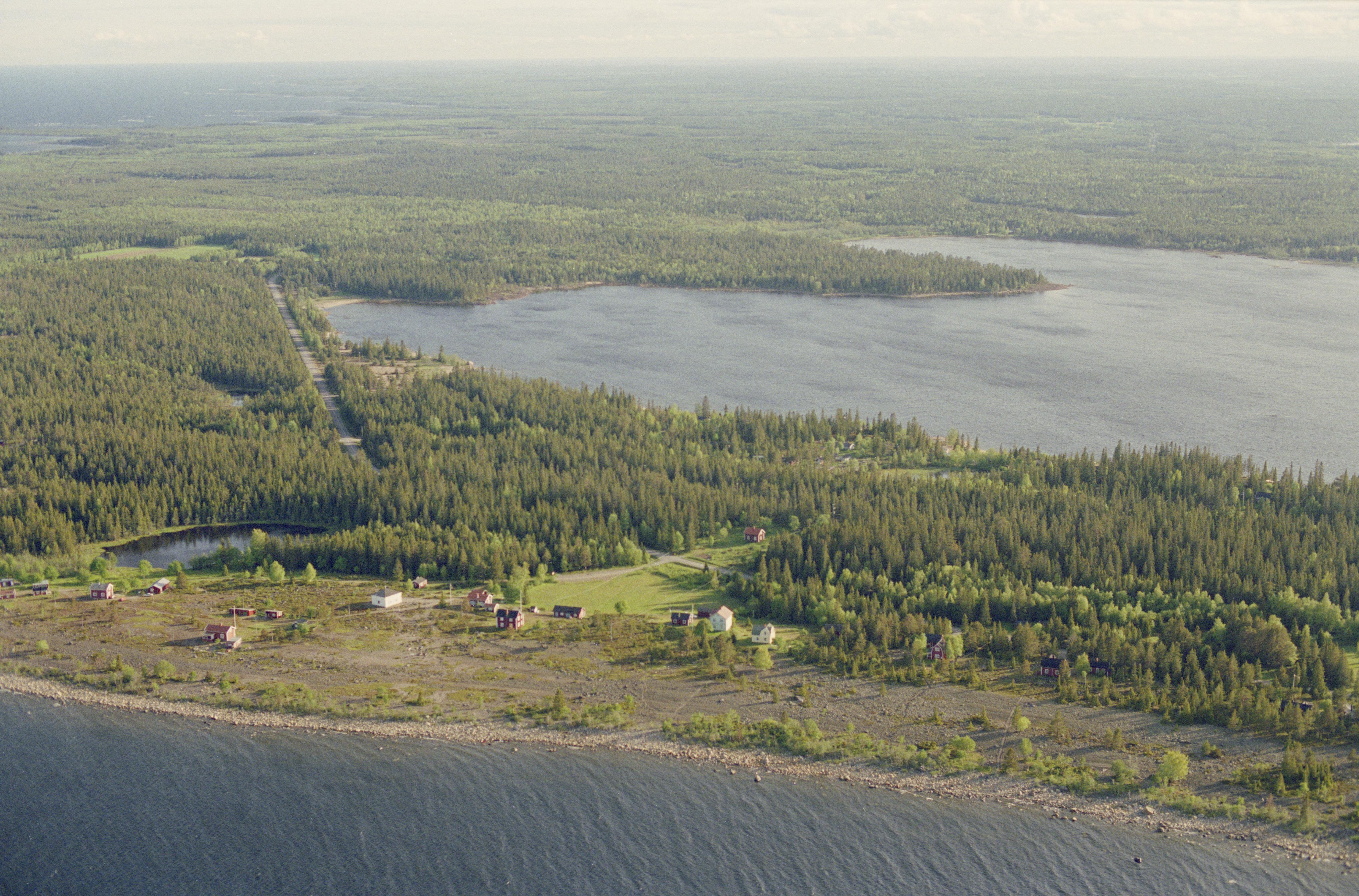 Beskrivning: Udden Bjuröklubb i Bjuröfjärden. östra stranden. Till vänster under bildens mitt Bjuröklubbs kapell (ljus byggnad) mellan fiskelägen RAÄnr Lövånger 134:1 och 496:1. Tjärnen Sundet till vänster om kapellet. Bilden är tagen mot (väderstreck): SV