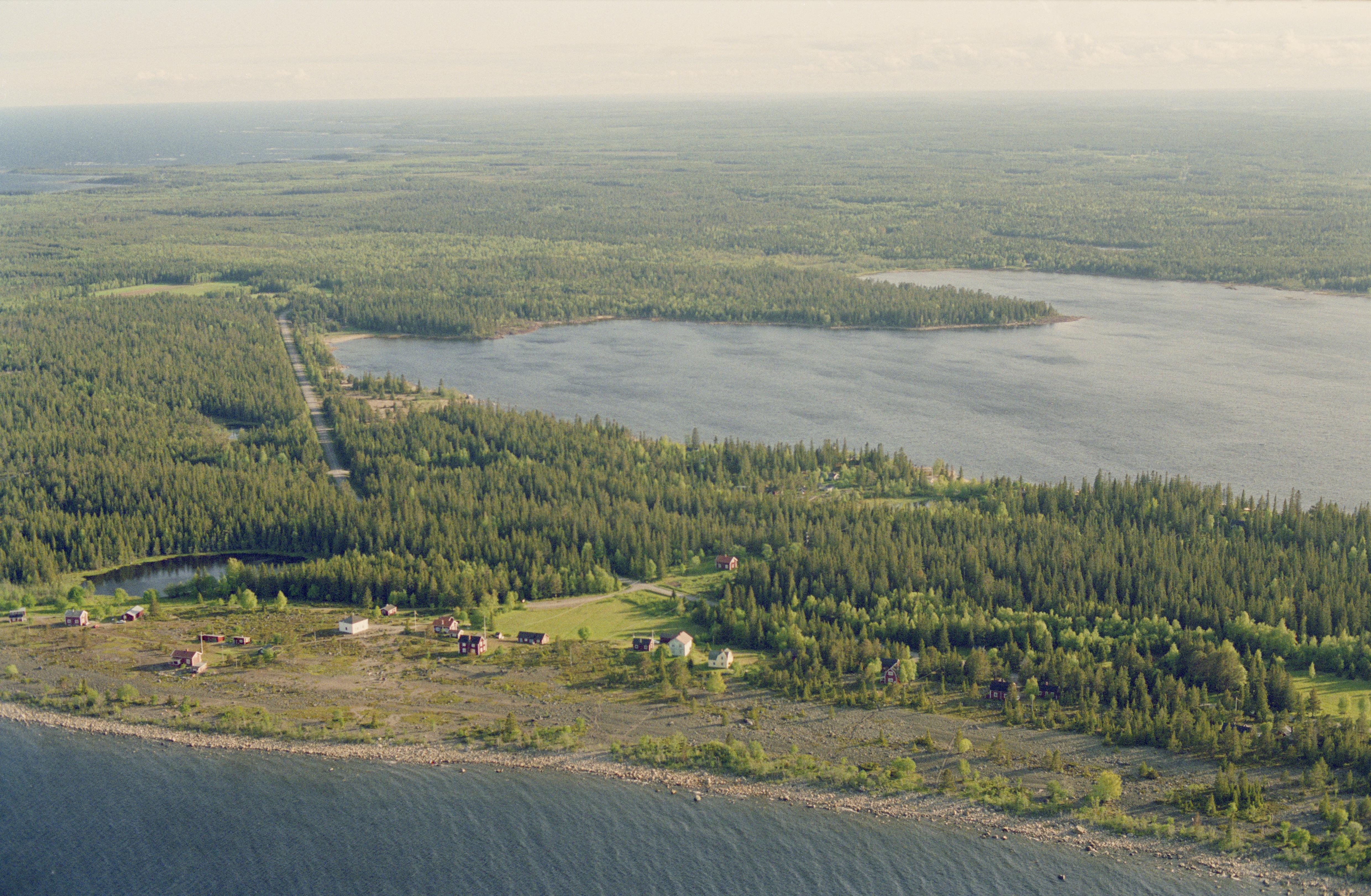 Beskrivning: Udden Bjuröklubb i Bjuröfjärden. östra stranden. Till vänster under bildens mitt Bjuröklubbs kapell (ljus byggnad) mellan fiskelägen RAÄnr Lövånger 134:1 och 496:1. Tjärnen Sundet till vänster om kapellet. Bilden är tagen mot (väderstreck): SV