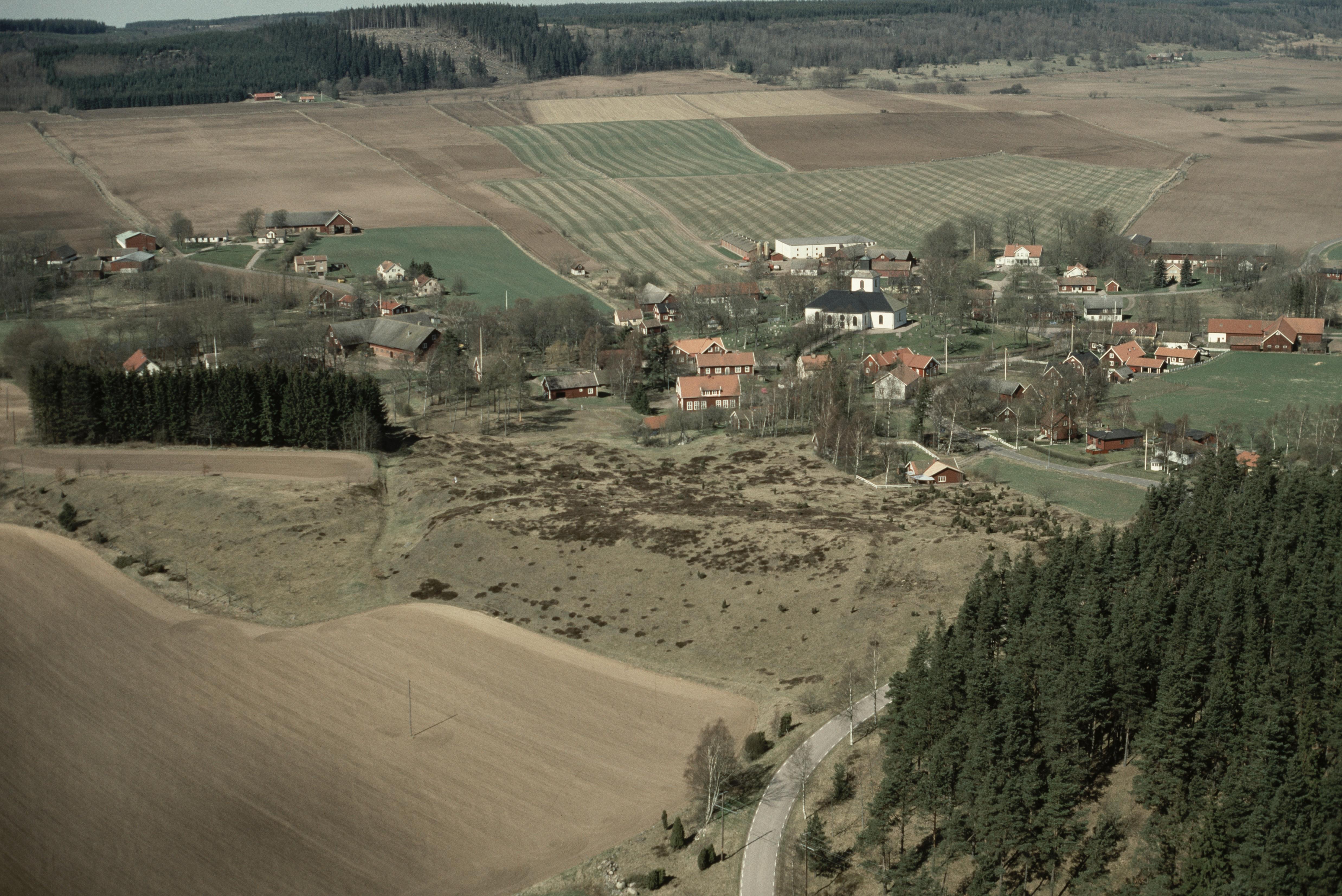 Beskrivning: Dimbo kyrkby. Dimbo-Ottravads kyrka och gravfält RAÄnr Dimbo 6:1 vid bildens mitt. Bilden är tagen mot (väderstreck): NV