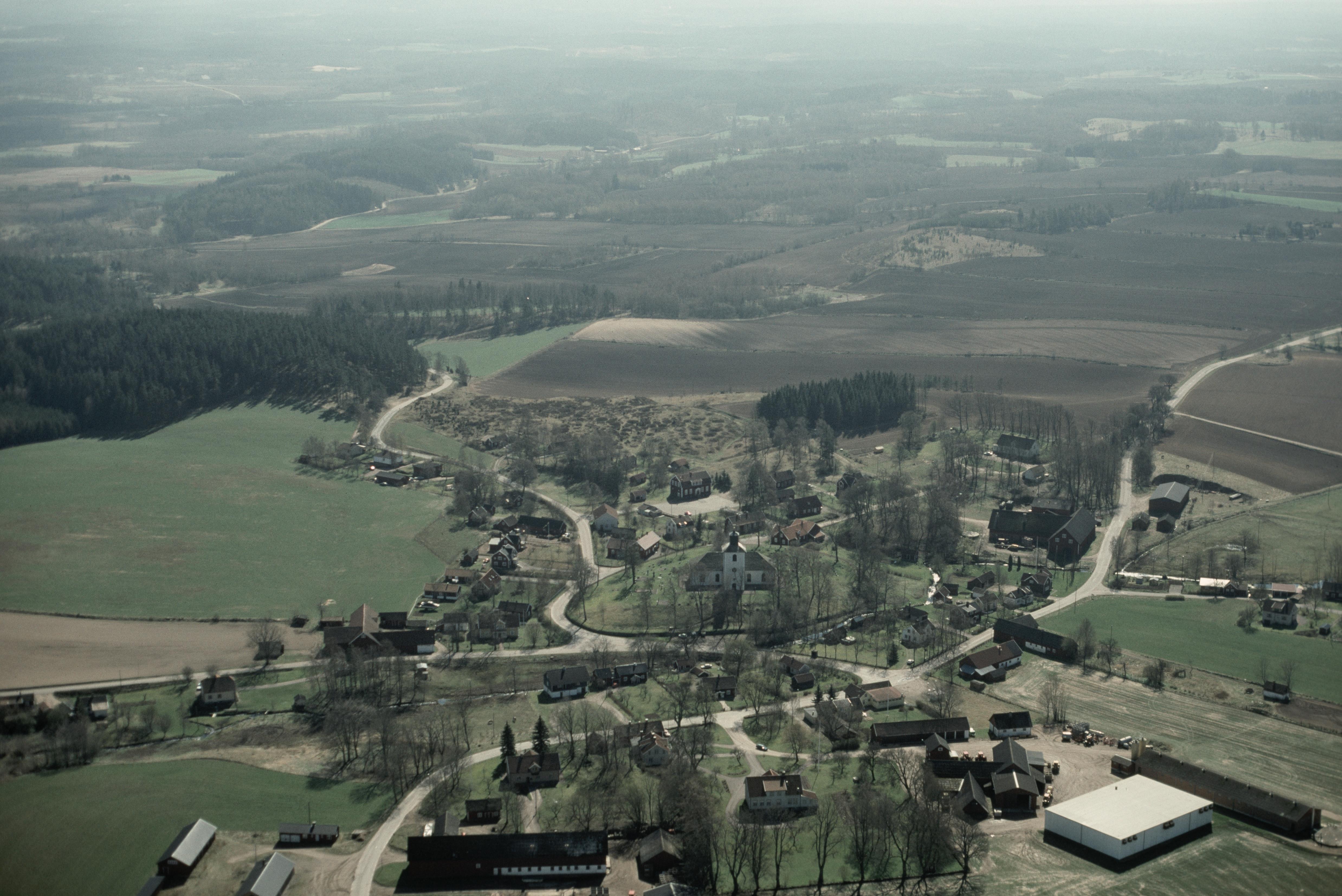 Beskrivning: Dimbo kyrkby. Dimbo-Ottravads kyrka och gravfält RAÄnr Dimbo 6:1 vid bildens mitt. Bilden är tagen mot (väderstreck): S