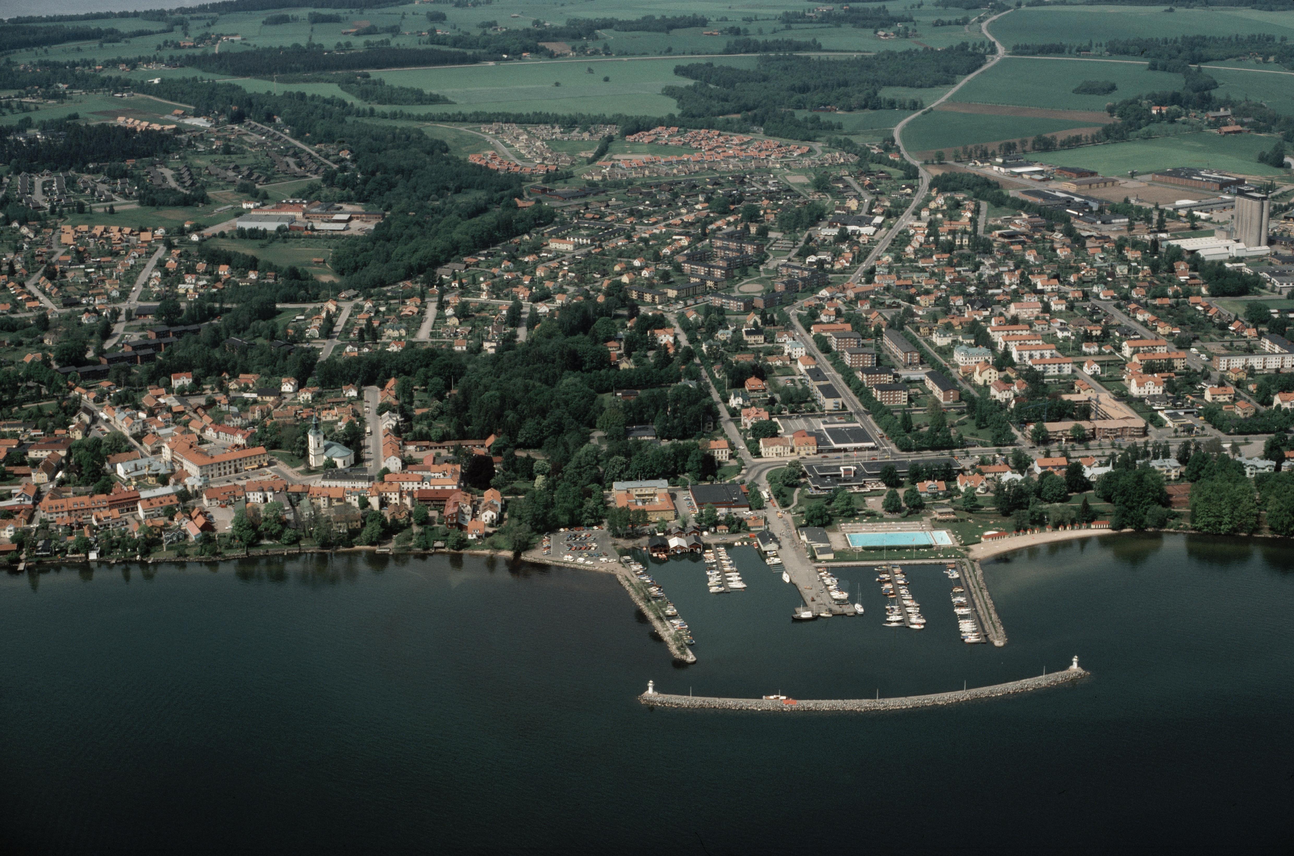 Beskrivning: Hjo stad vid sjön Vättern. Hjo kyrka nere till vänster om bildens mitt. Bilden är tagen mot (väderstreck): VNV