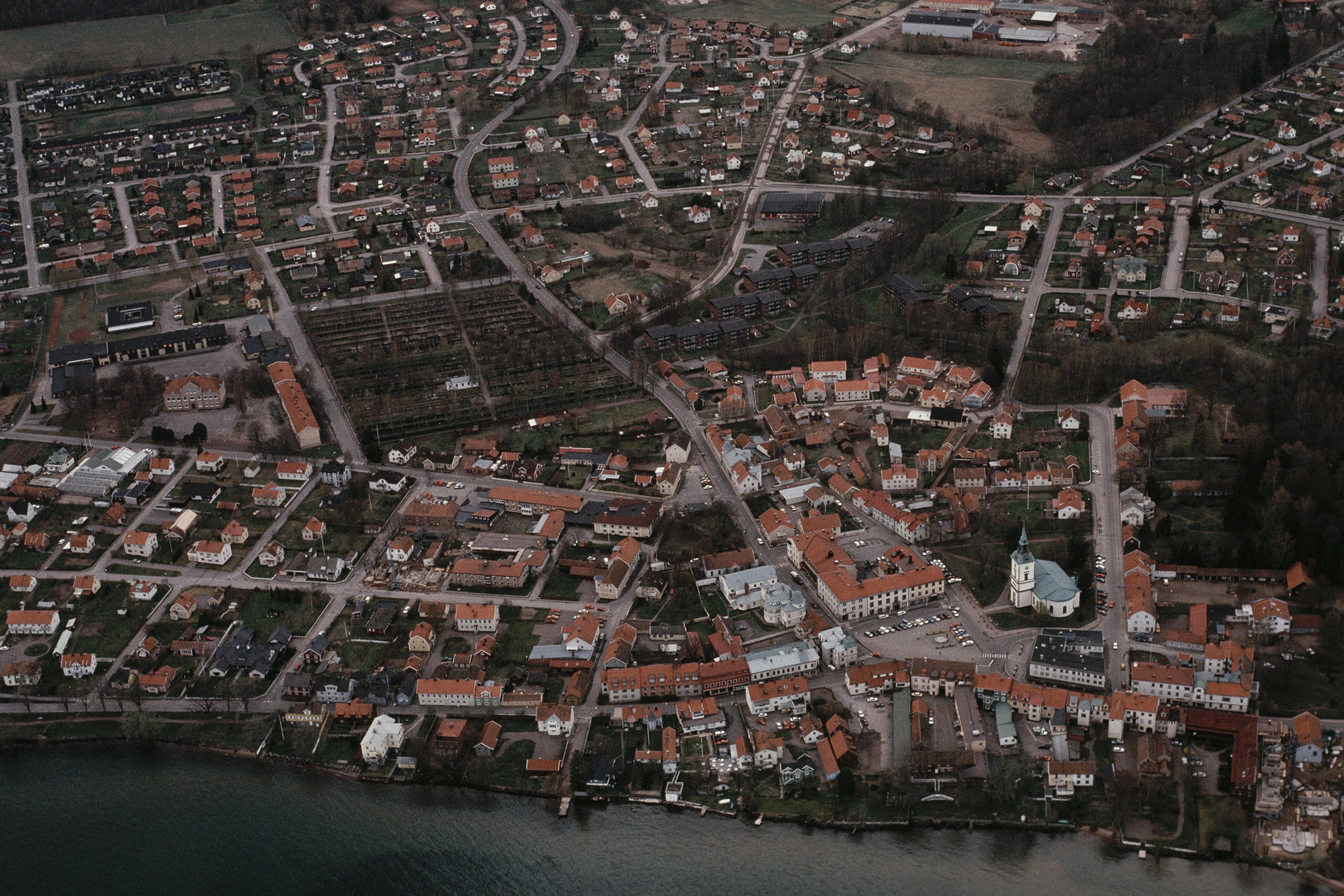 Beskrivning: Hjo stad vid sjön Vättern. Hjo kyrka nere till höger. Bilden är tagen mot (väderstreck): V