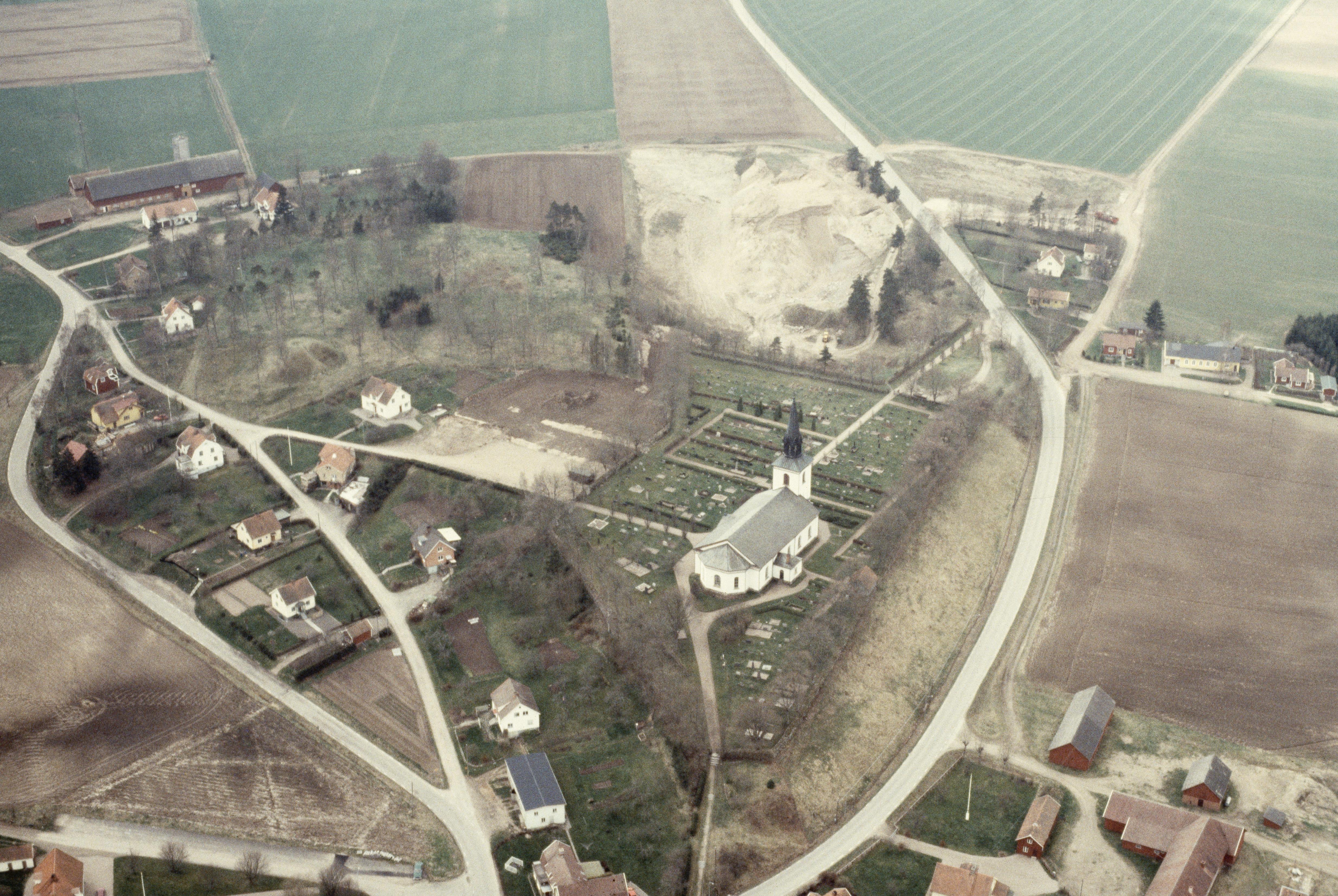 Beskrivning: Larvs kyrka. Vid kyrkan hög och gravfält "Larva Bäsing" RAÄnr Larv 22:1. Bilden är tagen mot (väderstreck): SV