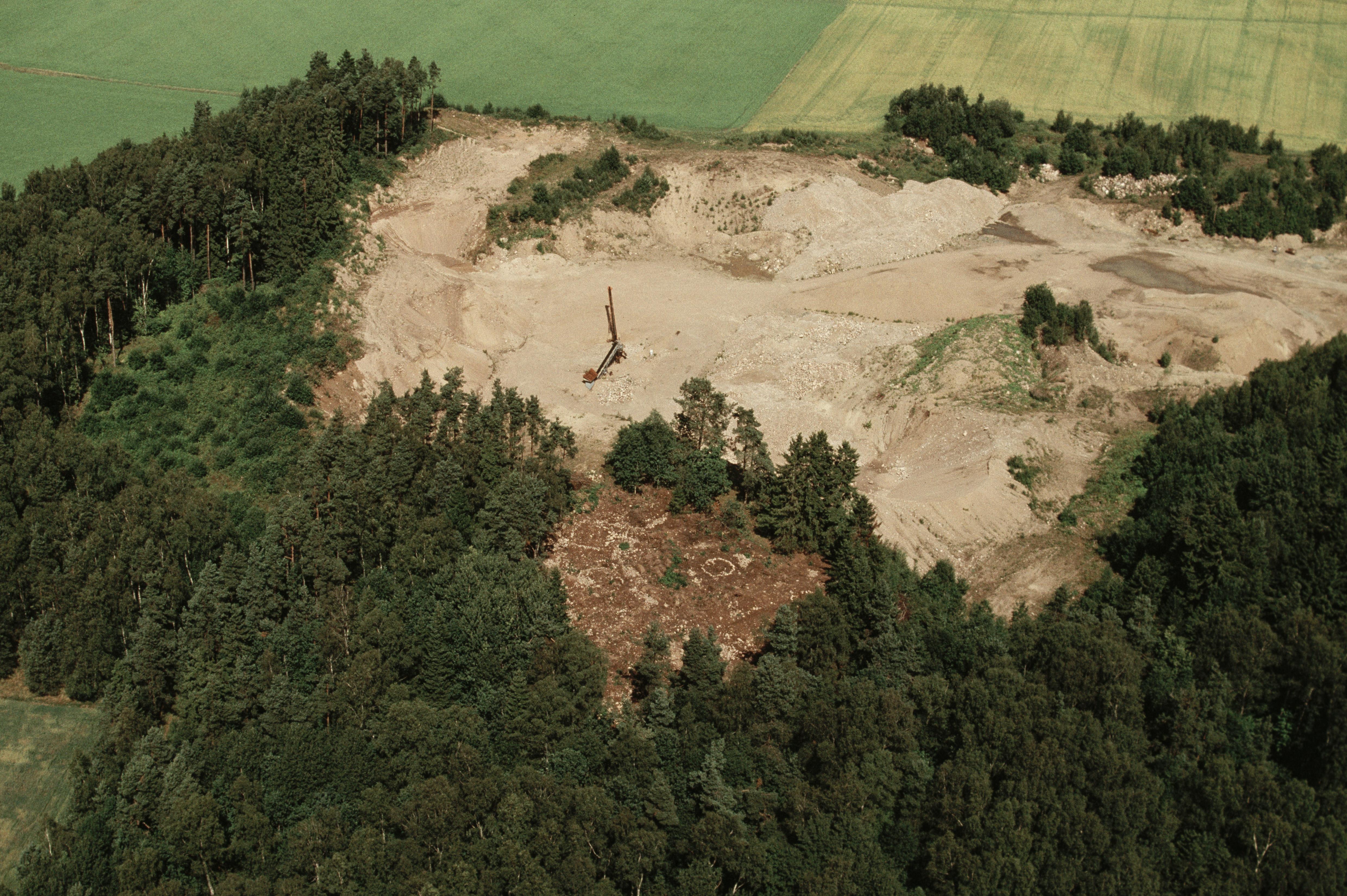 Beskrivning: Ledsberget gravfält RAÄnr Larv 208:1 och 209:1 (fossil åkermark) vid ett sandtag. Bilden är tagen mot (väderstreck): NO