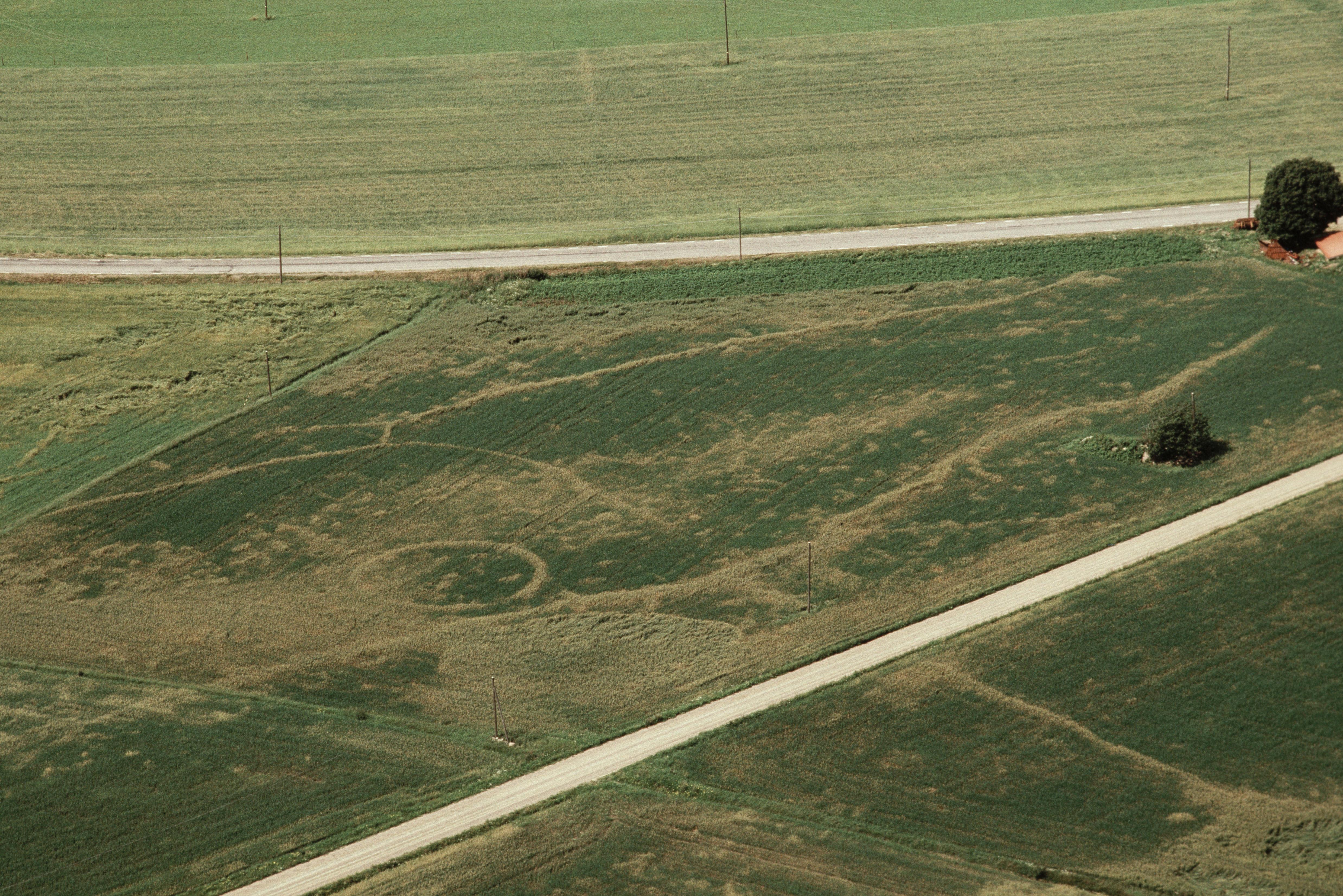 Beskrivning: Cropmarks i åker. Domarring RAÄnr Larv 32:1 och hög och stensättning Larv 39:1-2, m.fl. Bilden är tagen mot (väderstreck): V