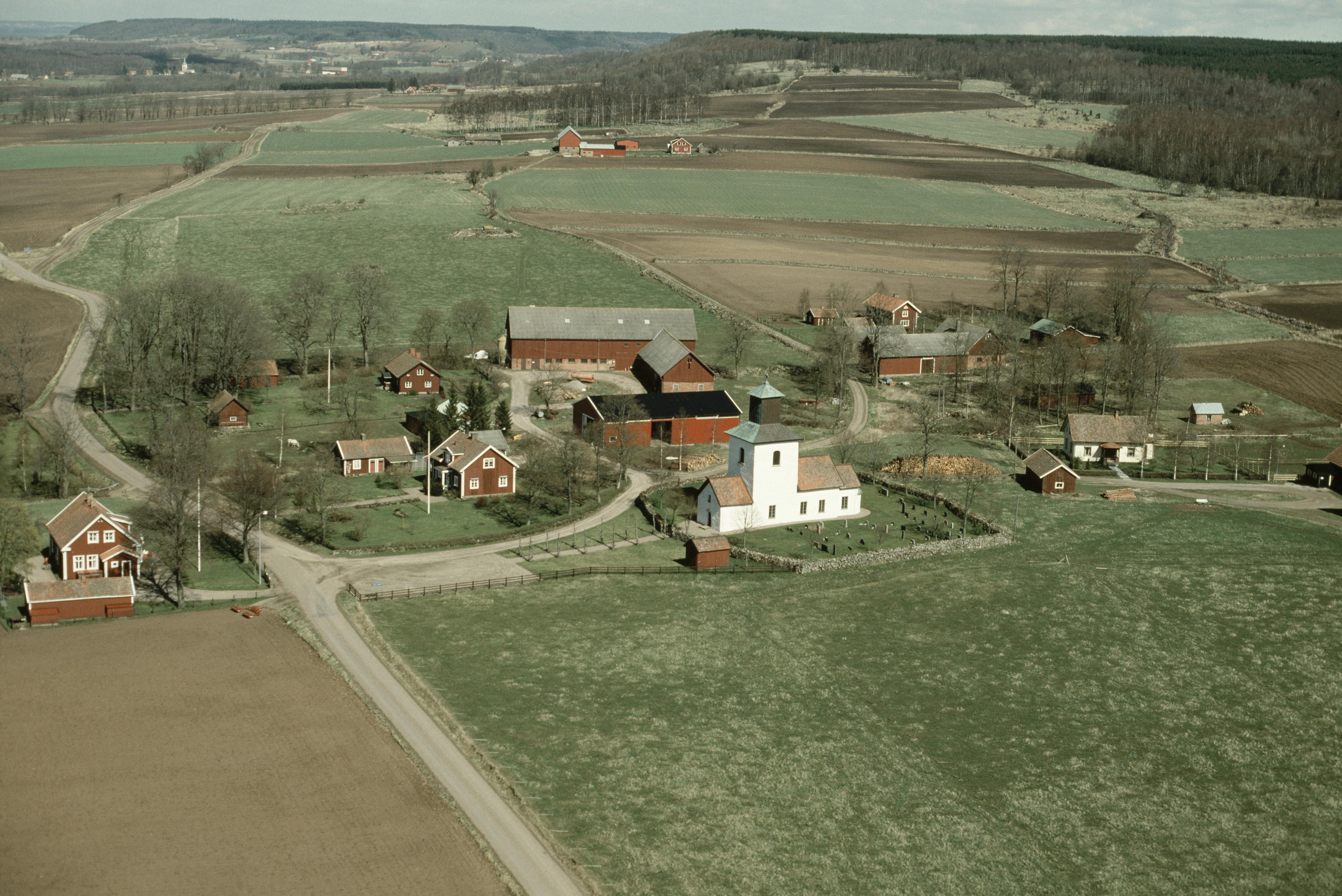 Beskrivning: Mularps kyrka och kyrkby. Bilden är tagen mot (väderstreck): NNO