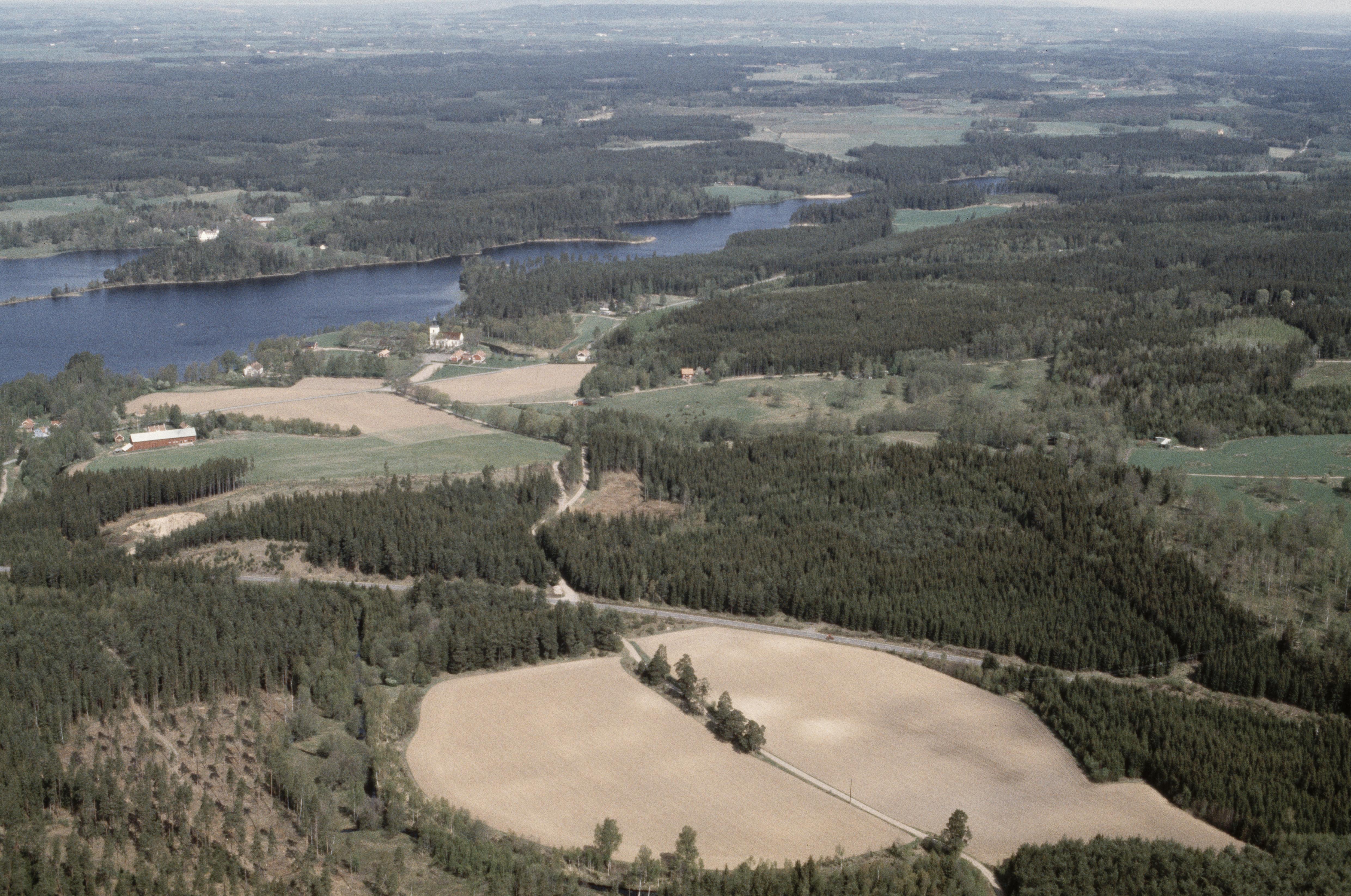 Beskrivning: Färdväg RAÄnr Sandhem 167:1 vid bildens mitt. Sandhems kyrka vid Sandhemssjön uppe till vänster om bildens mitt. Bilden är tagen mot (väderstreck): NV
