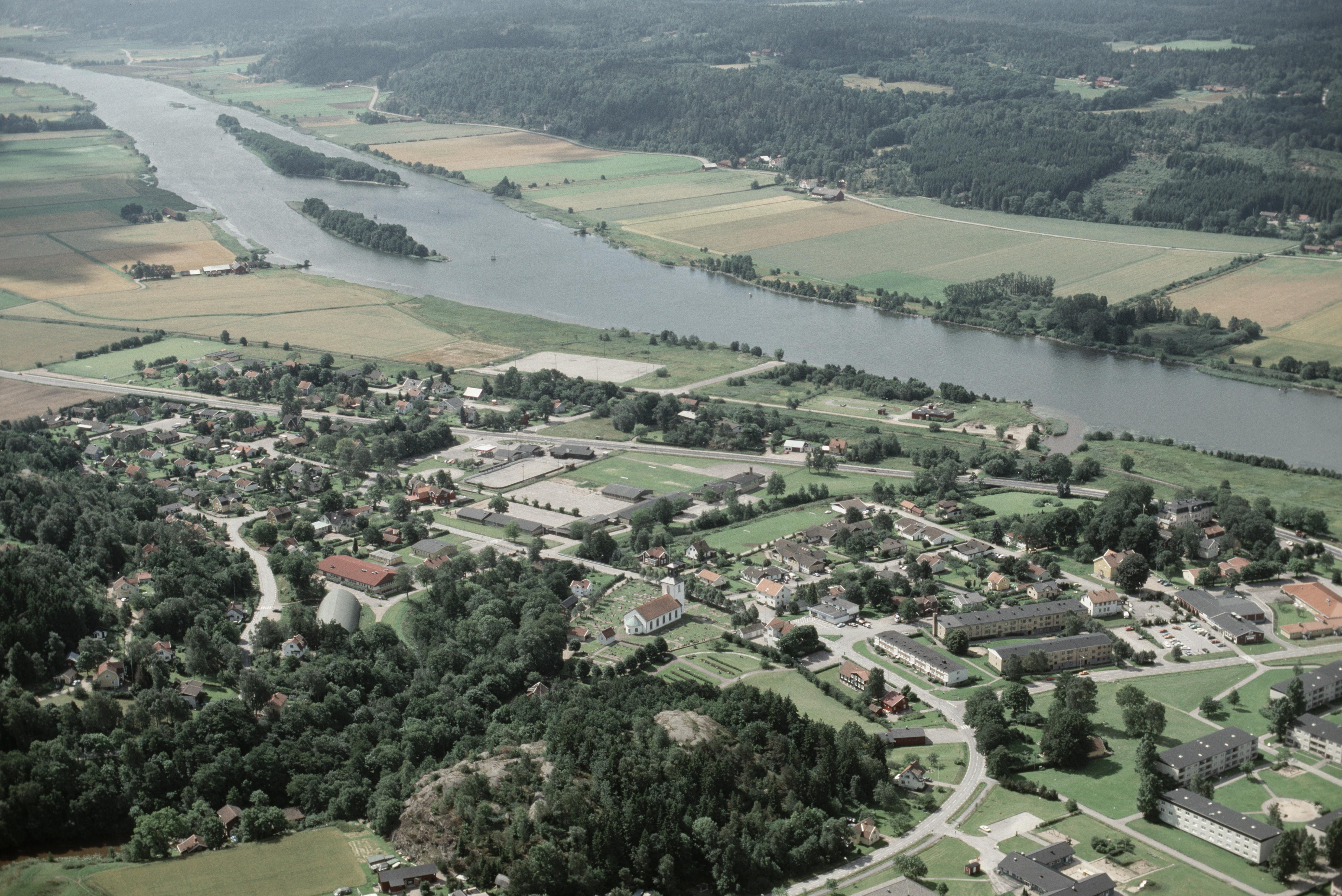 Beskrivning: Lödöse tätort vid Göta älv. Sankt Peders kyrka till vänster om bildens mitt. Bilden är tagen mot (väderstreck): SV