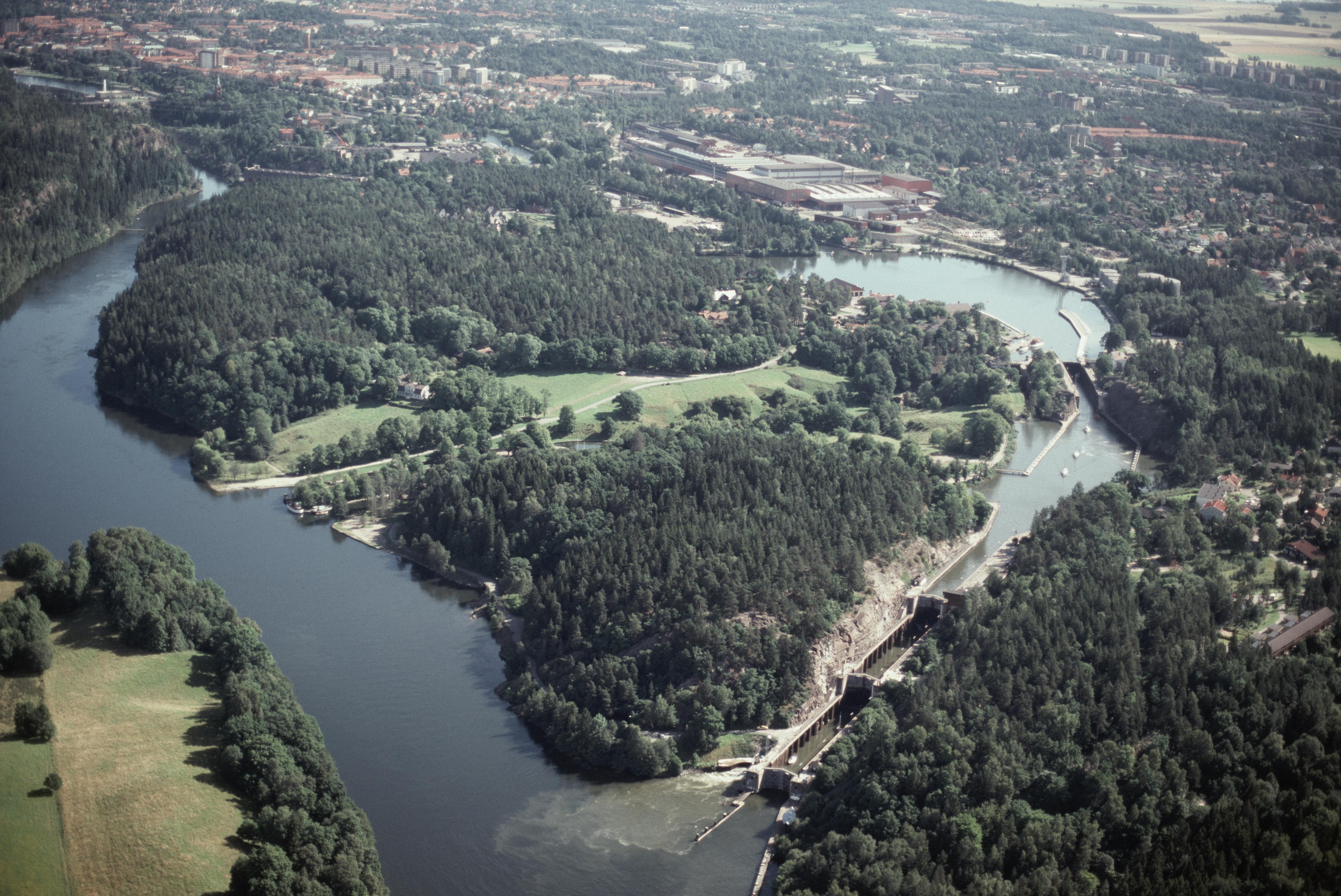 Beskrivning: Göta älv i Trollhättans stad. Slussar i kanalanläggning RAÄnr Trollhättan 128:1-2 m.fl. i Åkers sjö. Bilden är tagen mot (väderstreck): NO