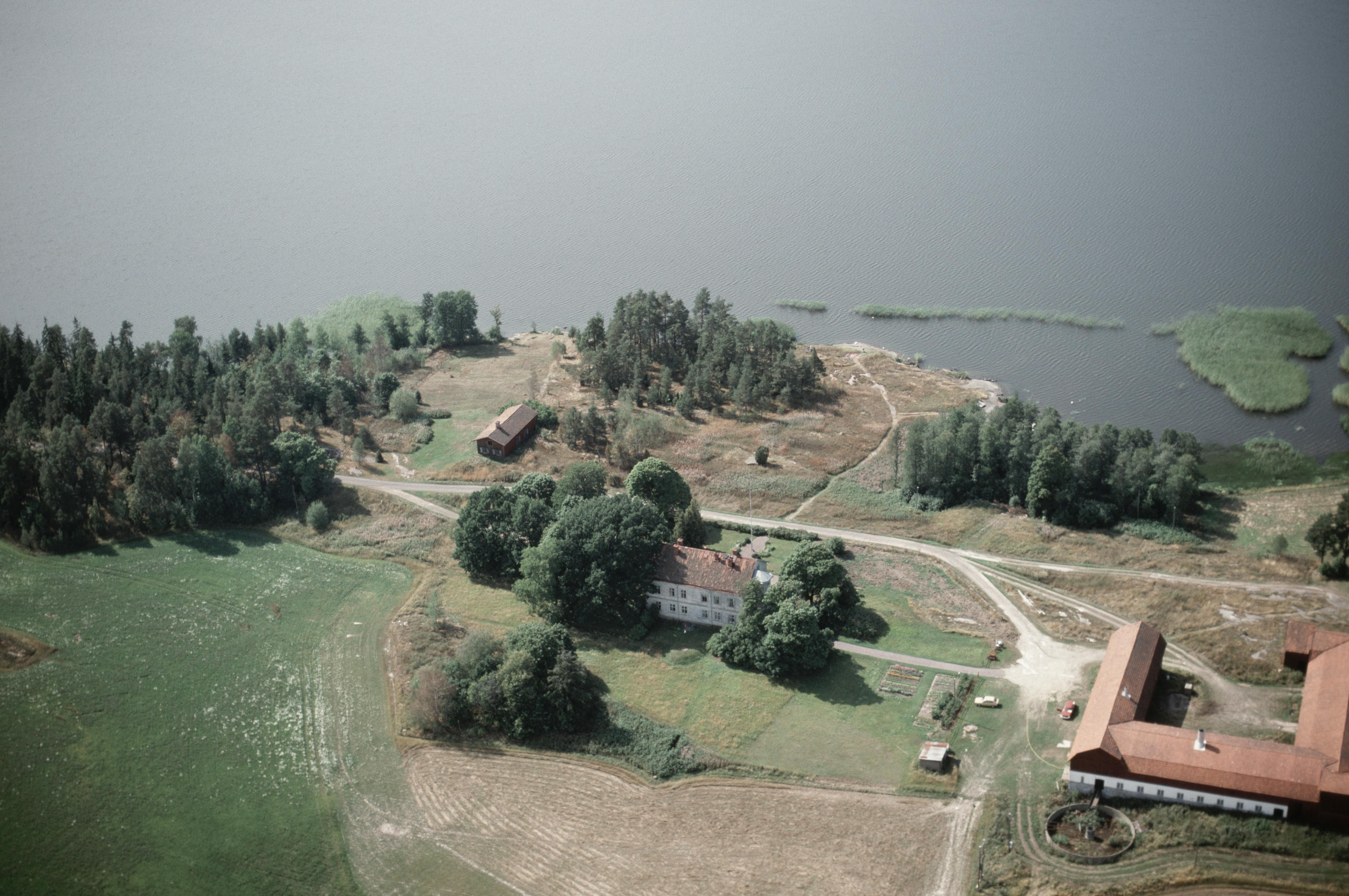 Beskrivning: Byn och Frödingsstugan (skrivs även Frödingstugan) vid sjön Alstern. I bildens vänstra kant stenhäll Trollbordet RAÄnr Alster 46:1. Bilden är tagen mot (väderstreck): V