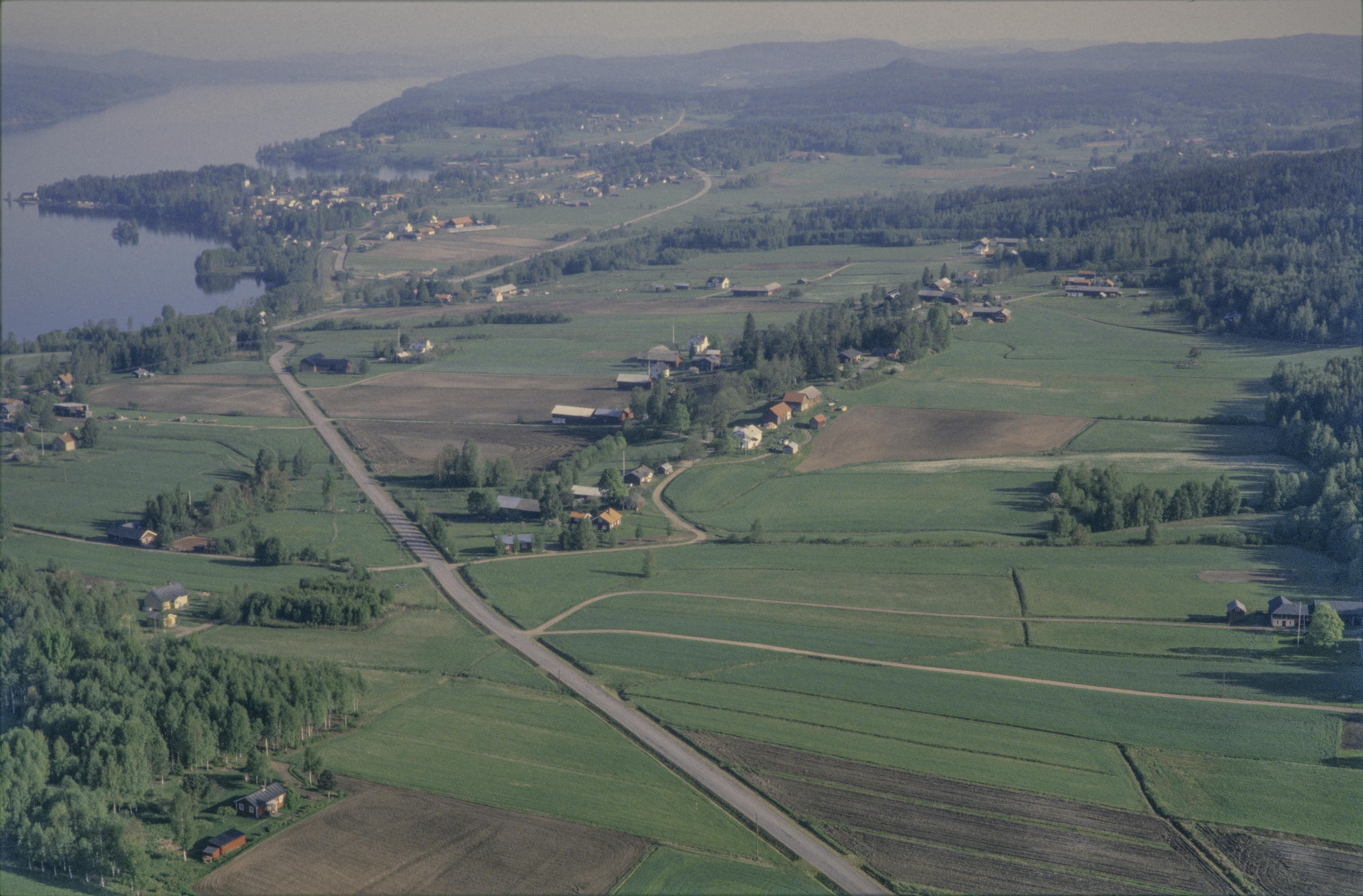 Beskrivning: Smideslämning RAÄnr Lysvik 34:1 vid Skäggegård till höger om bildens mitt. Uppe till vänster Lysvik kyrka och kyrkby vid sjön Övre Fryken. Bilden är tagen mot (väderstreck): NNV