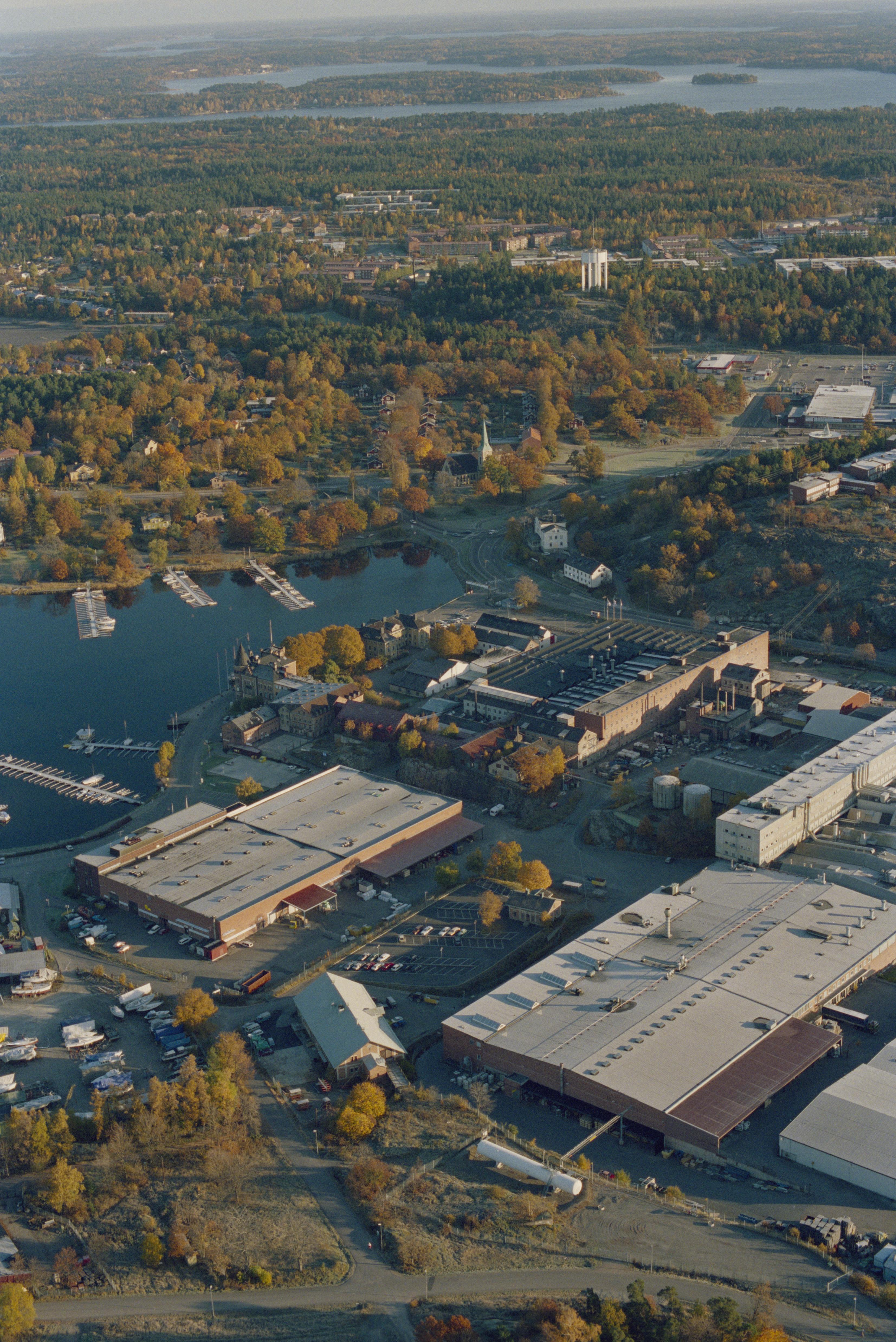Beskrivning: Gustavsbergs tätort vid Farstaviken. Porslinsfabrikerna i bildens nedre del. Vid bildens mitt Gustavsbergs kyrka och arbetarbostäder för porslinsfabriken, Grindstugatan RAÄnr Gustavsberg 36:1 och Värmdögatan. Bilden är tagen mot (väderstreck): NNO