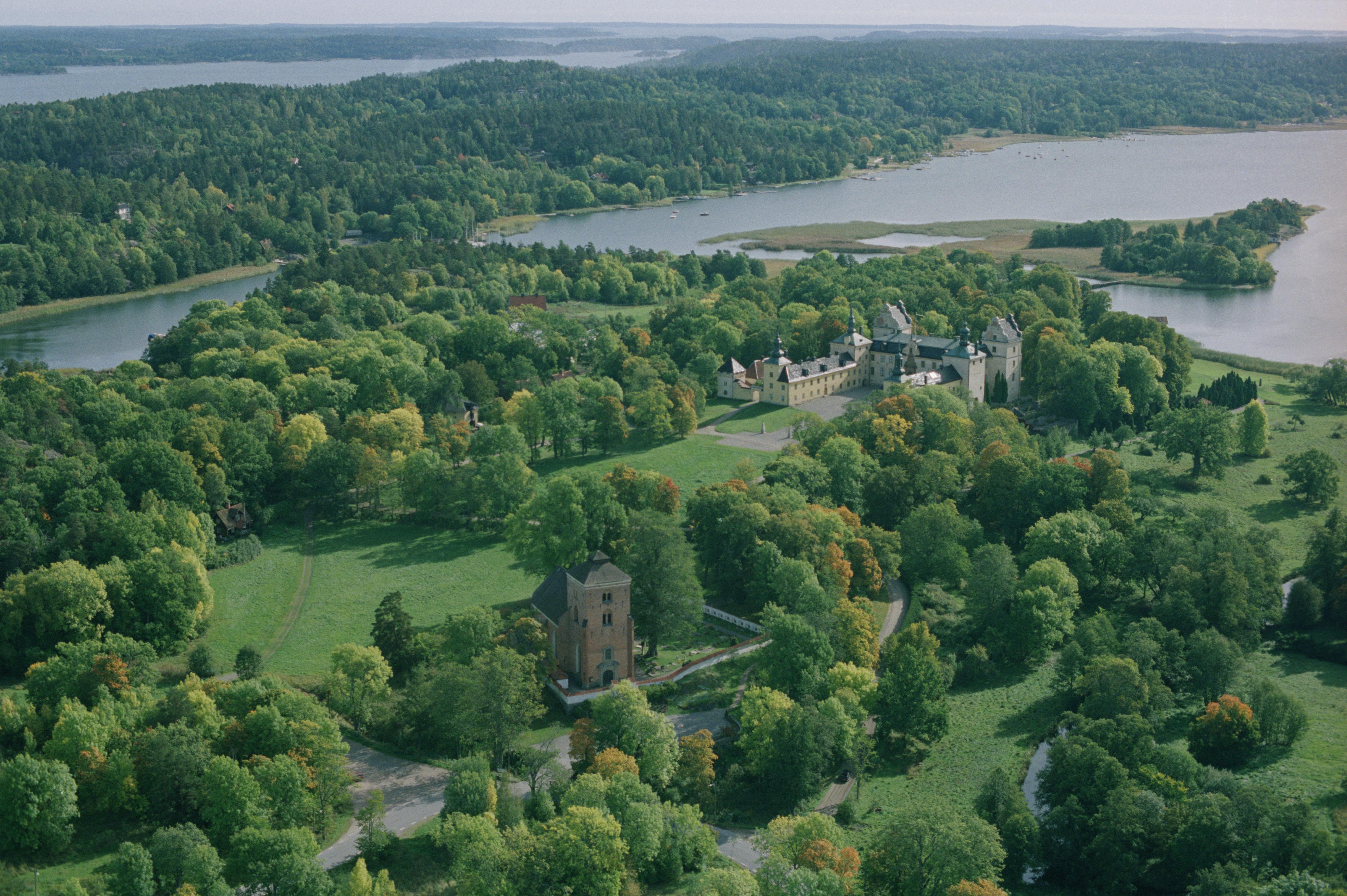 Beskrivning: Tyresö kyrka och Tyresö slott (byggnadsminne RAÄnr Tyresö 37:1) vid Kalvfjärden. Erstaviken i bildens övre del. Bilden är tagen mot (väderstreck): Ö