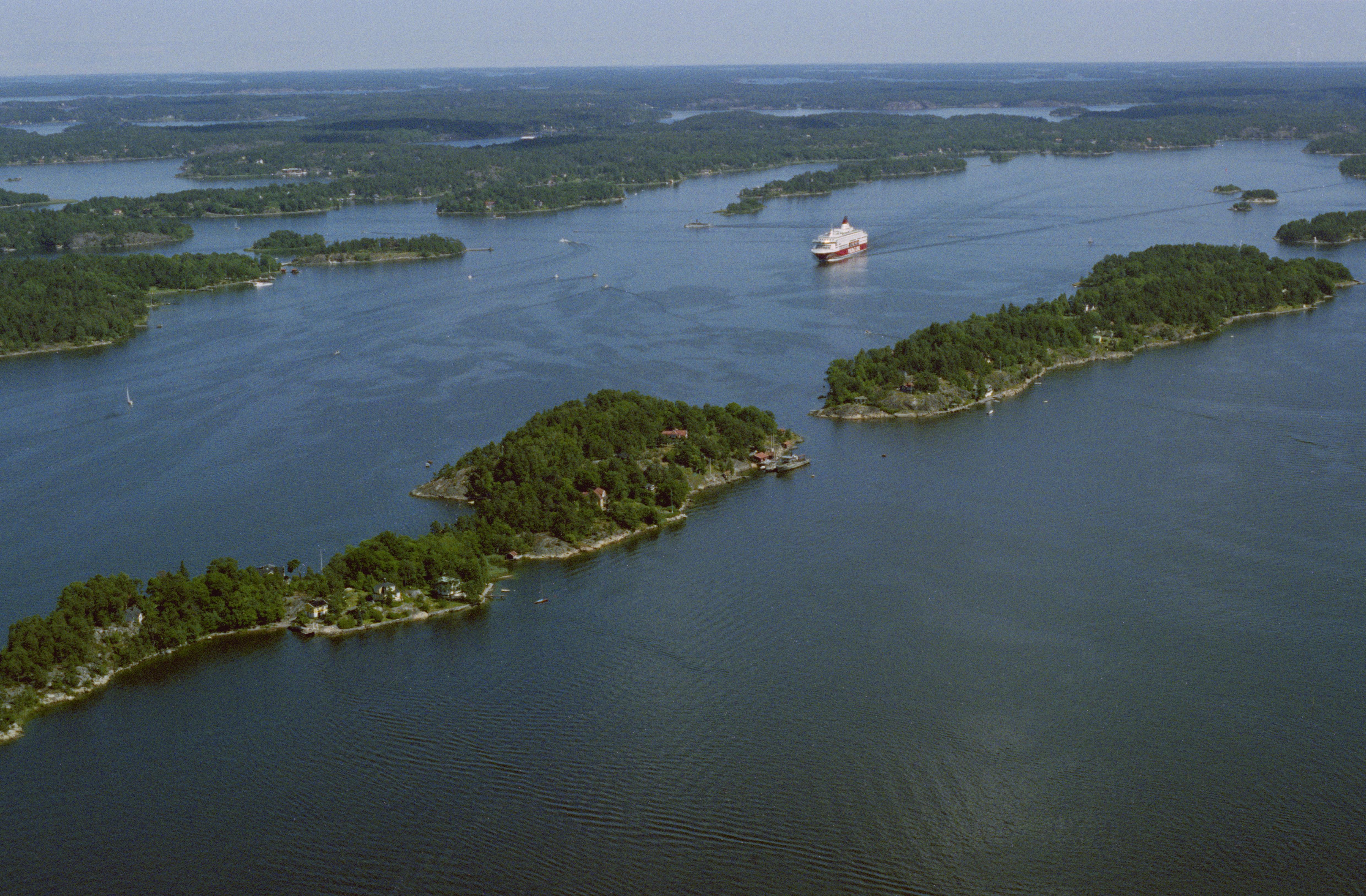 Beskrivning: Höggarnsfjärden på gränsen mellan socknen Östra Ryd och Vaxholm. I bildens övre del ett skepp (båt / färja) som åker mellan Karlsudd och Edlunda vid Vaxholm. Bilden är tagen mot (väderstreck): NO