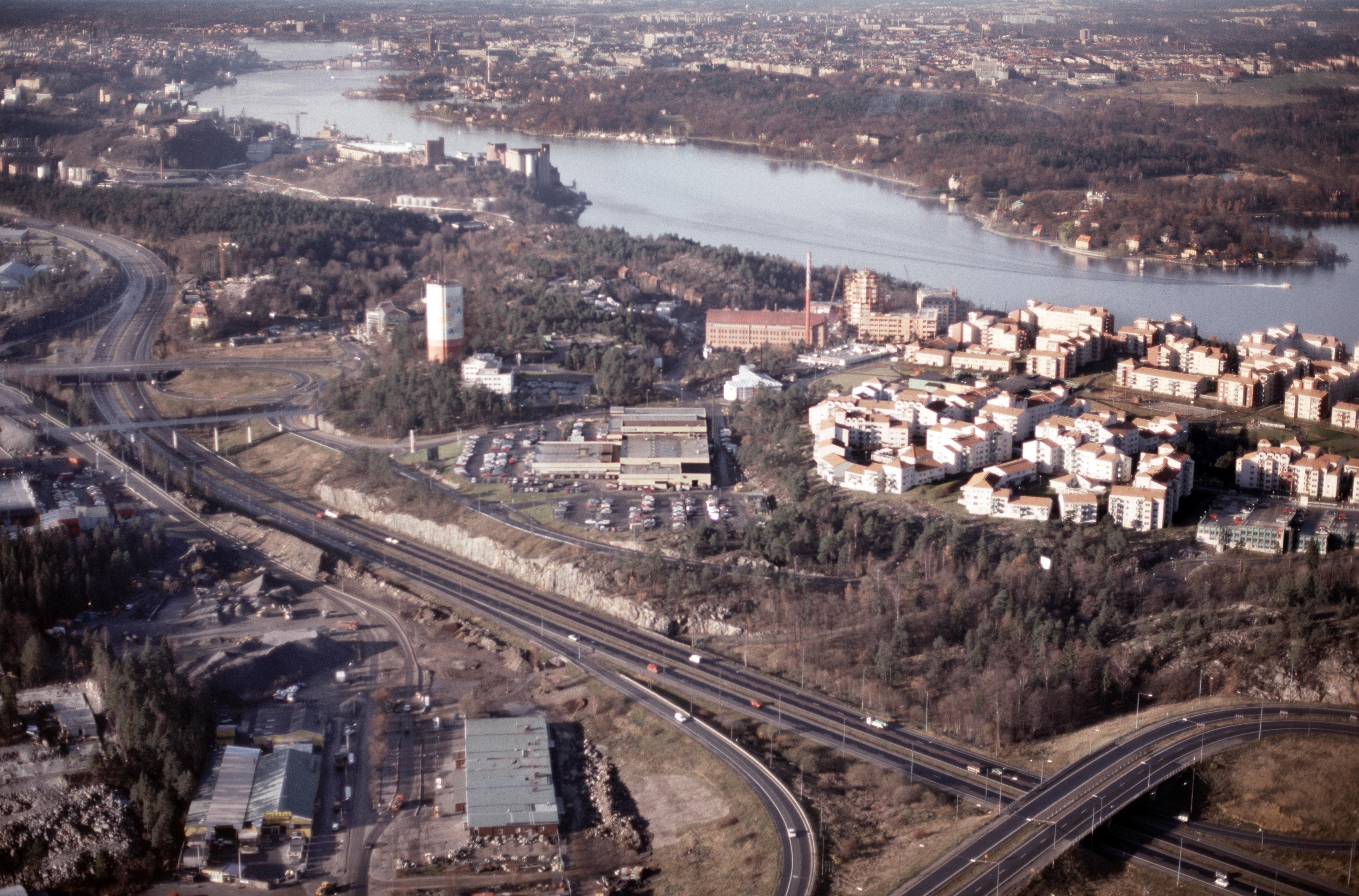 Beskrivning: Järla och Skvaltan vid Nacka centrum på Sicklaön. Vid bildens mitt Jarlaberg, Augustendal, Kvarnholmen, Nacka strand m.fl. I bildens övre del farleden Saltsjön mot Stockholms stad och Djurgården. Bilden är tagen mot (väderstreck): NV