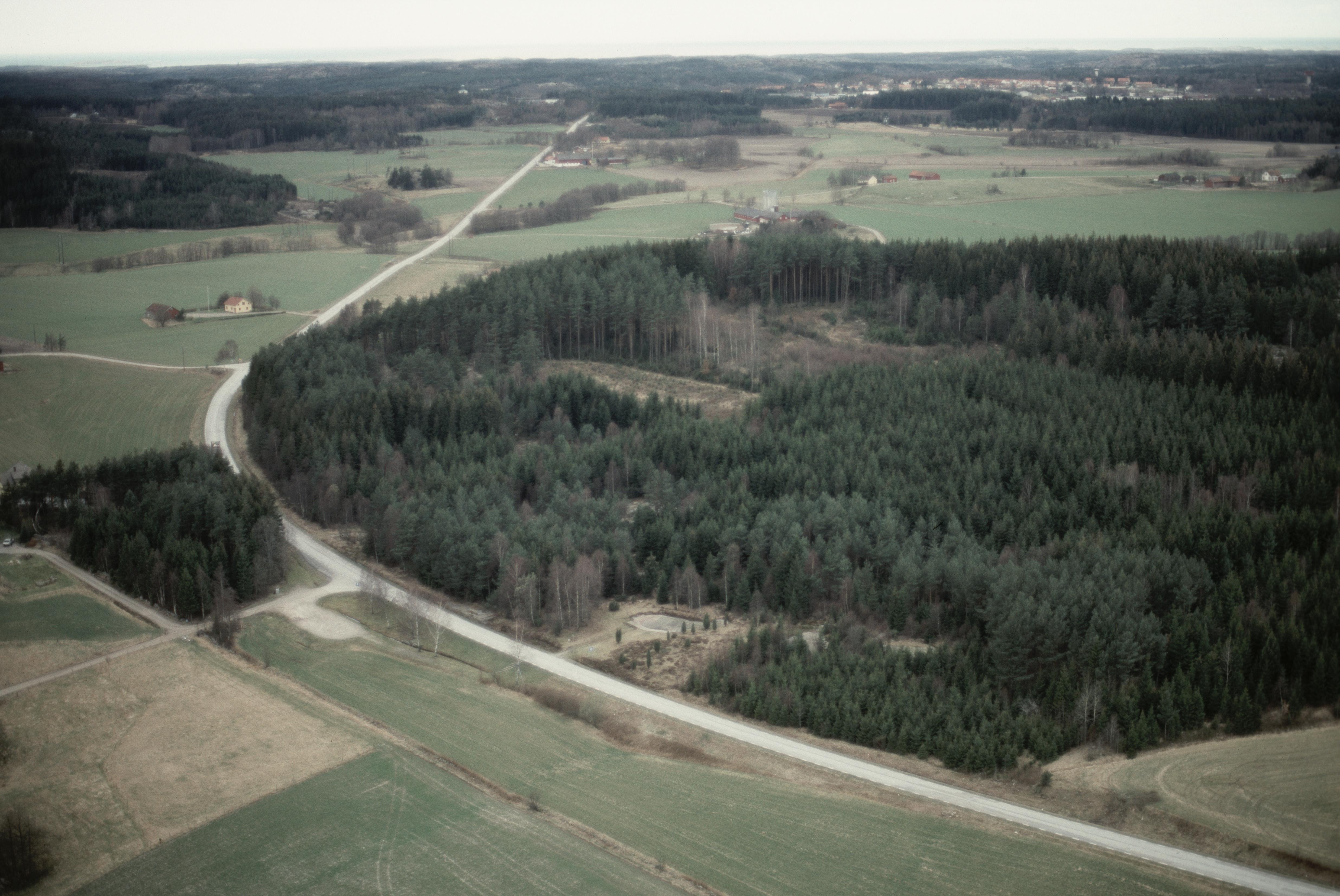 Beskrivning: Tanumsslätten. Gramseälven i bildens övre del. Hällristningsområde i fornlämningsrik dalgångsbygd. Hällristning RAÄnr Tanum 149:1, 255:1, 261:1 m.fl. vid bildens mitt. Bilden är tagen mot (väderstreck): SV