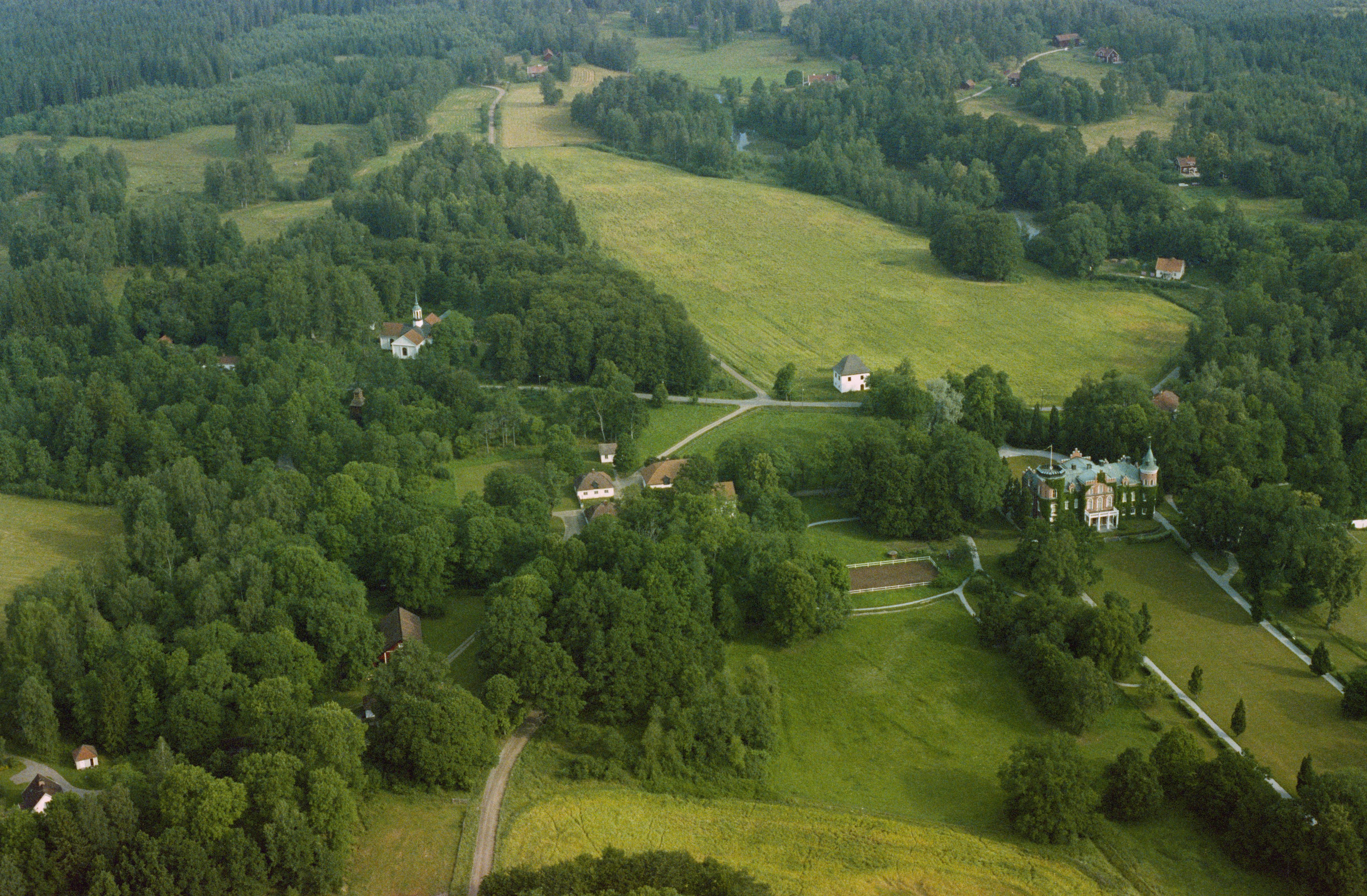 Beskrivning: Boo fideikommiss / Boo slott RAÄnr Bo 51:1 vid Bosån. Boo Gårdskyrka till vänster om bildens mitt. Bilden är tagen mot (väderstreck): N