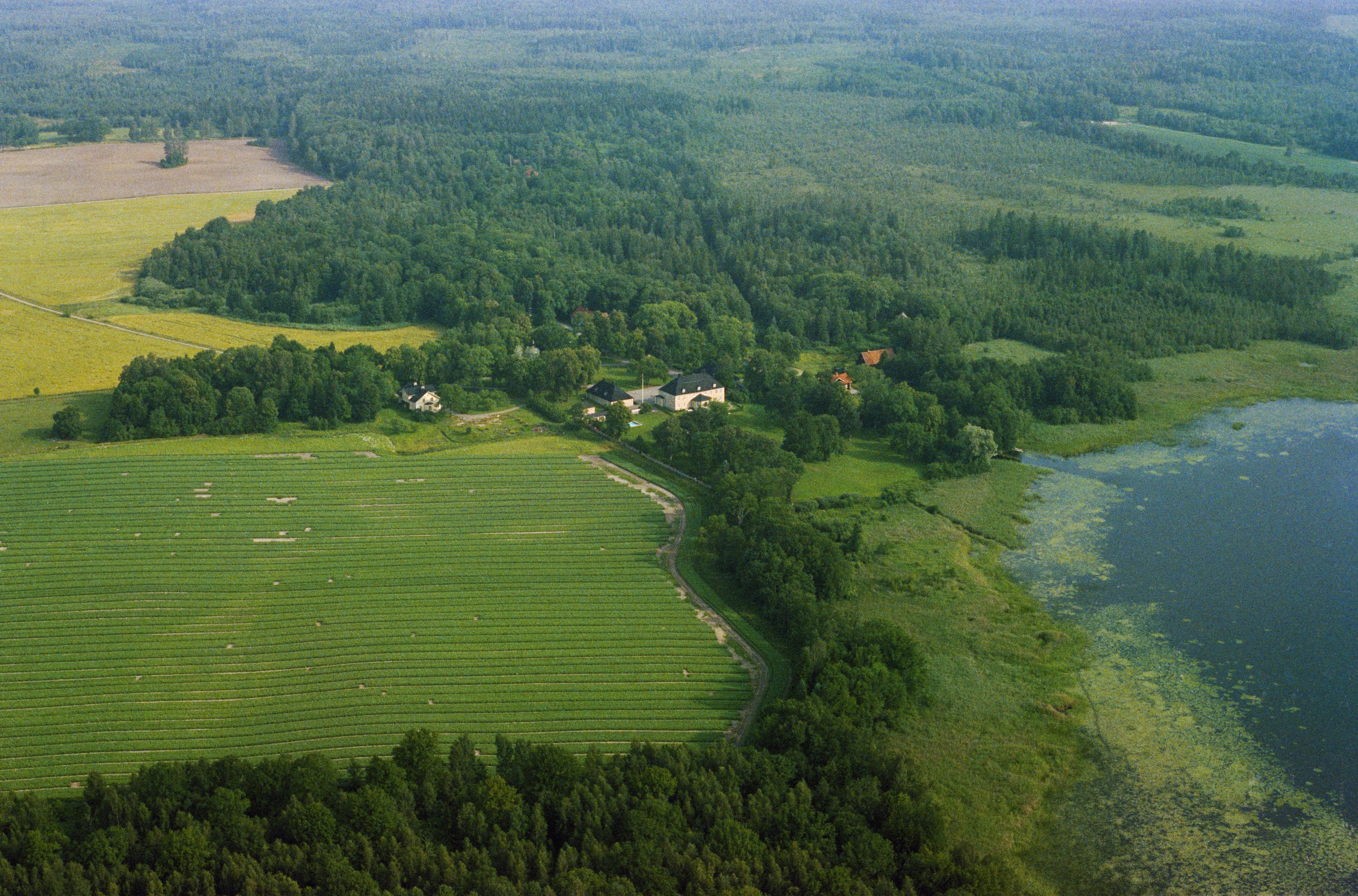 Beskrivning: Bystads herrgård fastighet Bystad 1:7 vid Bystadviken. Fatbursbyggnad till höger om bildens mitt. Bilden är tagen mot (väderstreck): N