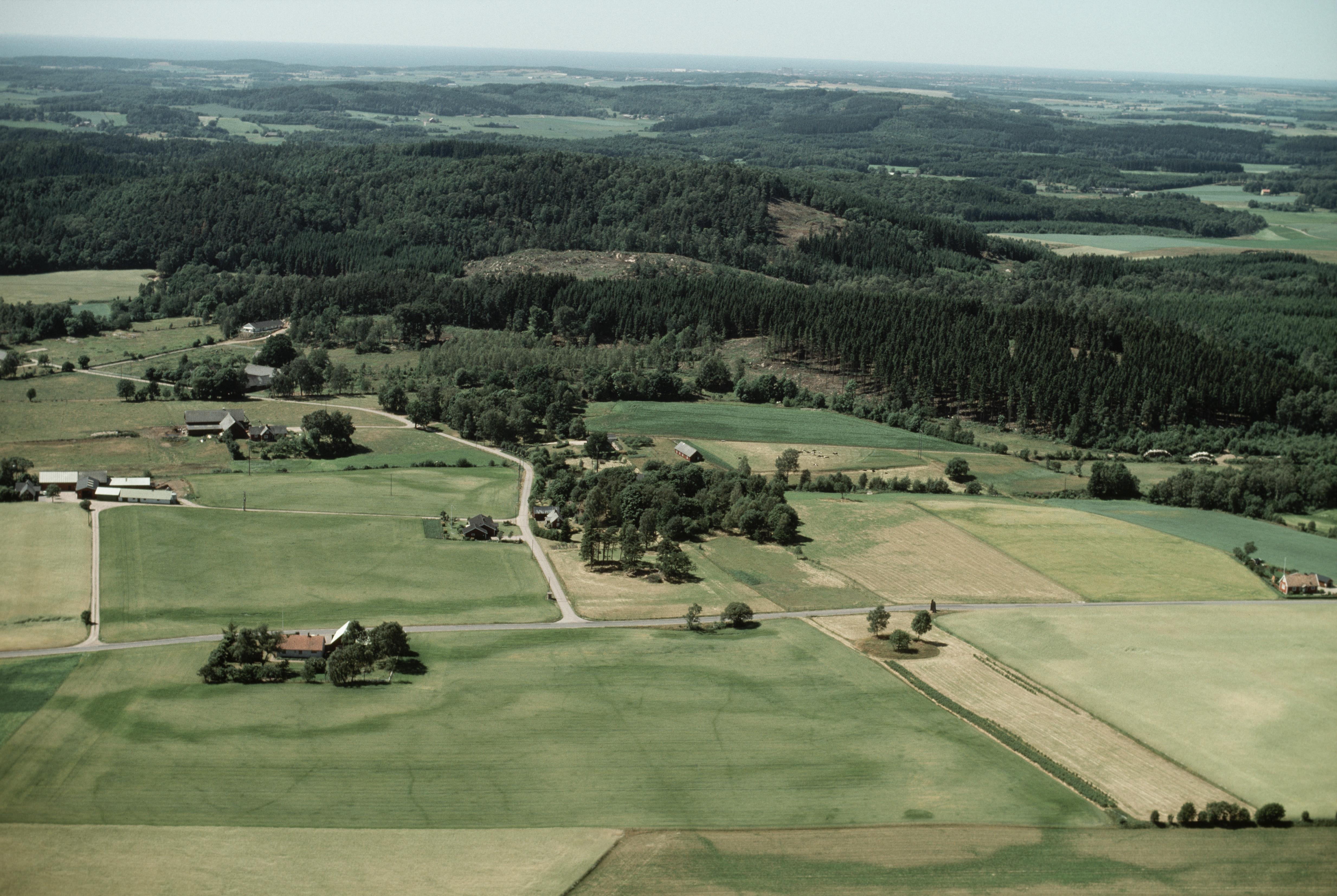 Beskrivning: Fornborg och stensättningen Hagbards stenar / Hagbards galge RAÄnr Asige 17:1 (vid bildens mitt) norr om Asige by. Bilden är tagen mot (väderstreck): V