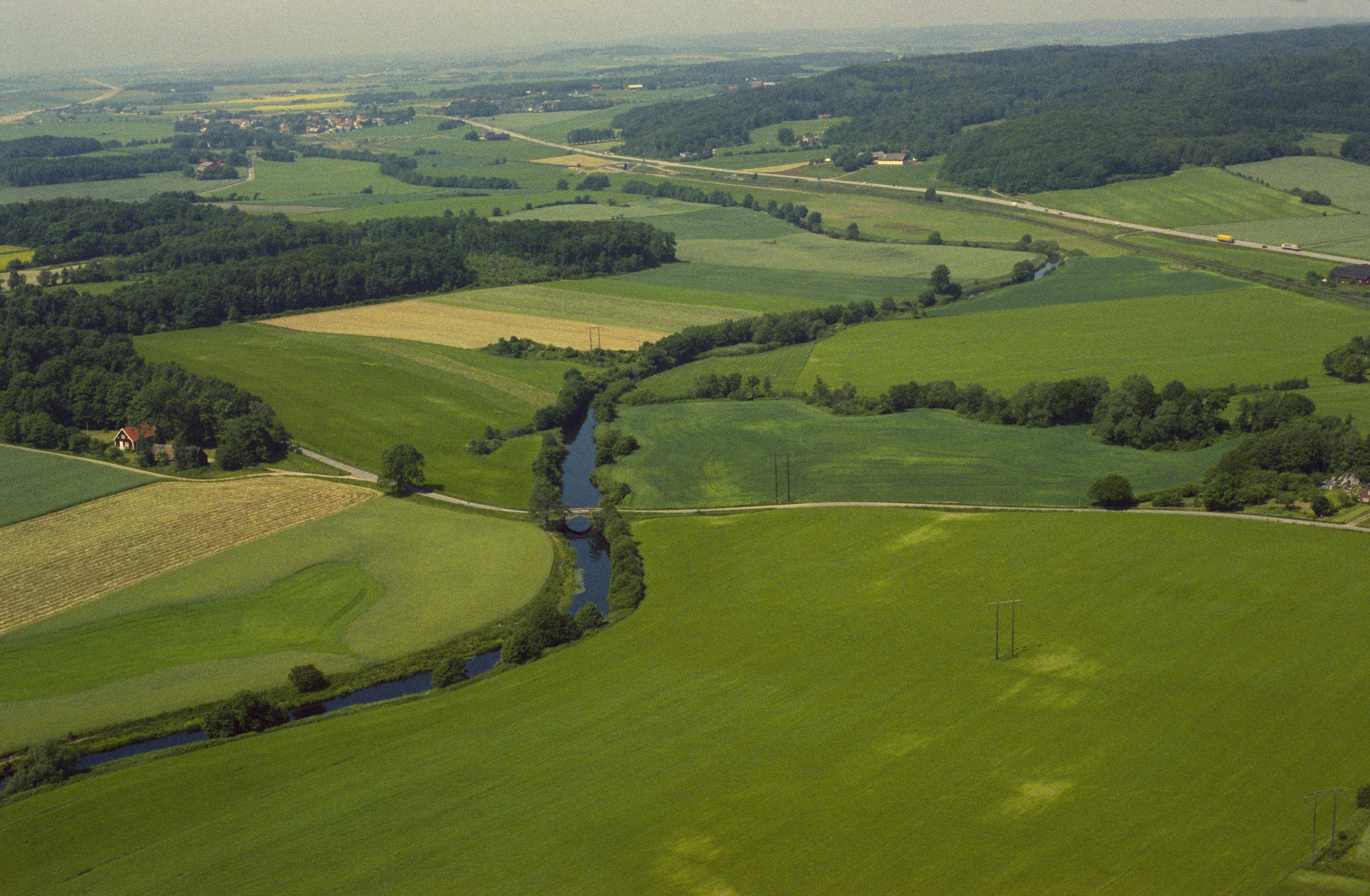 Beskrivning: Vid bildens mitt stenvalvsbro RAÄnr Eftra 87:1 över Suseån vid Broen, på gränsen mellan socknen Eftra och Slöinge (i bildens övre del). Bilden är tagen mot (väderstreck): N
