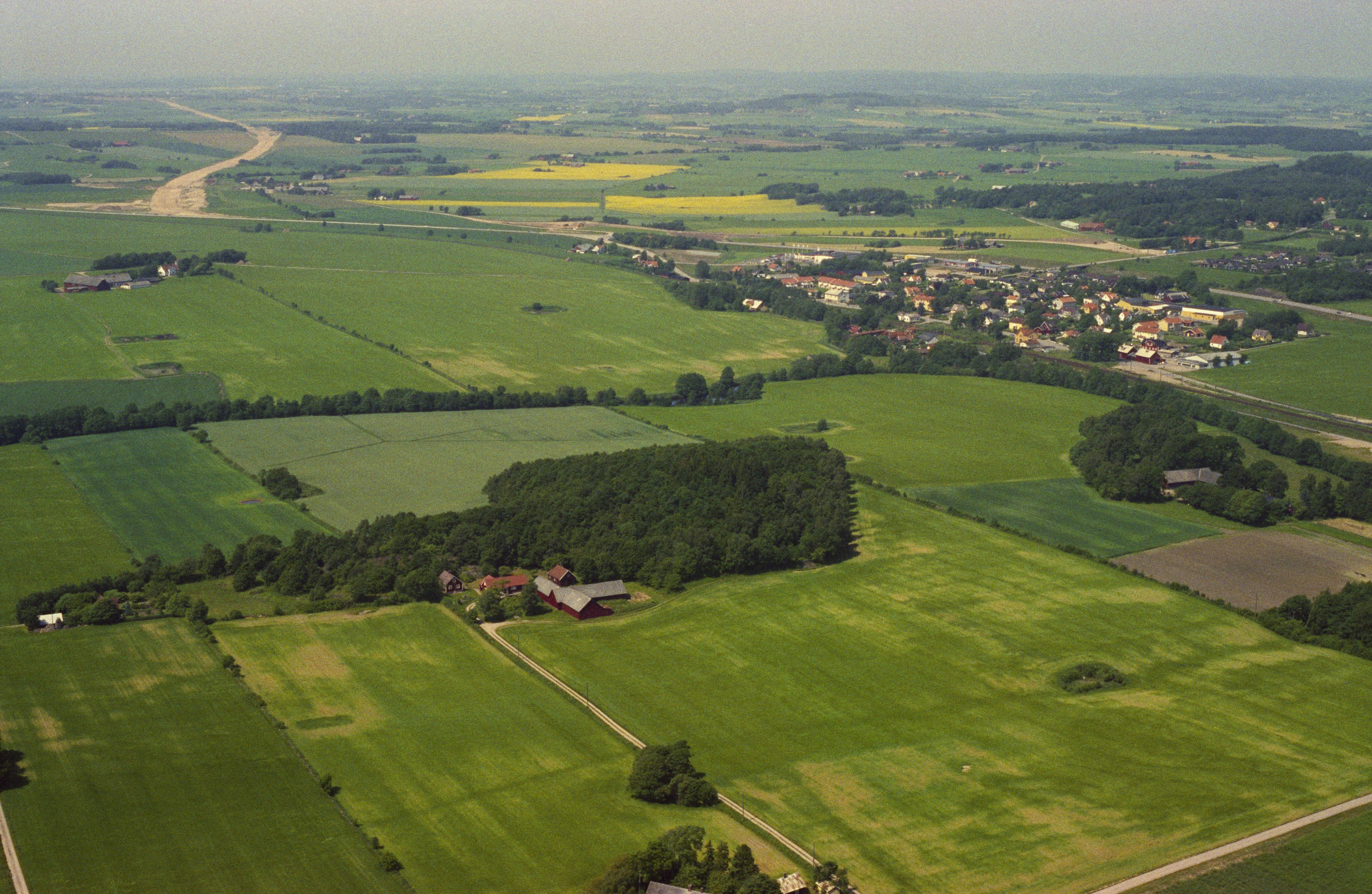 Beskrivning: Vid gränsen mellan socknen Eftra, Skrea (uppe till vänster) och Årstad (uppe till höger). Väg E6 byggs vid området Broen, söder om Heberg. Bilden är tagen mot (väderstreck): NV