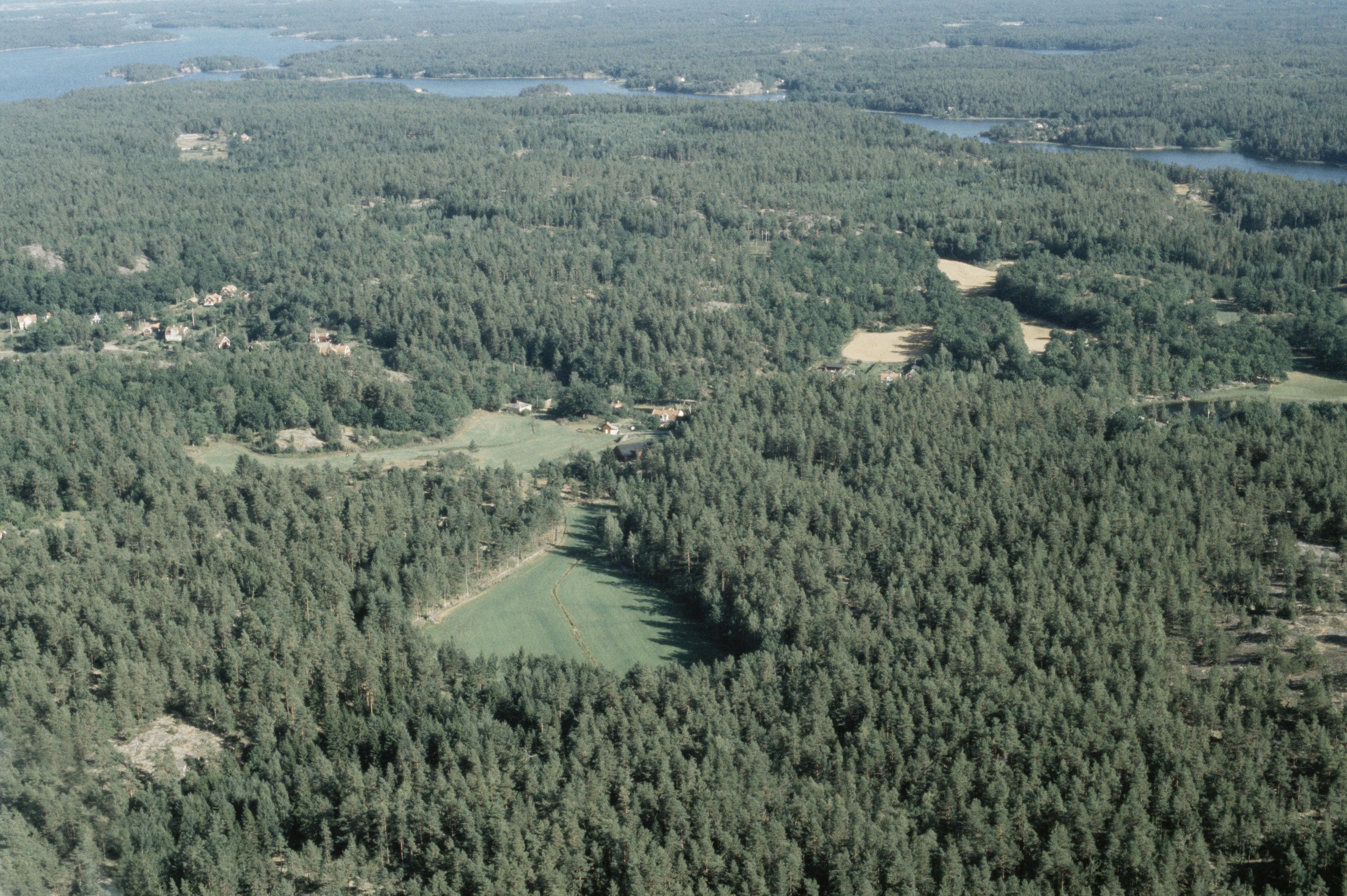 Beskrivning: Boplats RAÄnr Hjorted 778 nere till vänster. I bildens övre del Solstadström och Solstadshalvön i socknet Misterhult. Bilden är tagen mot (väderstreck): Ö