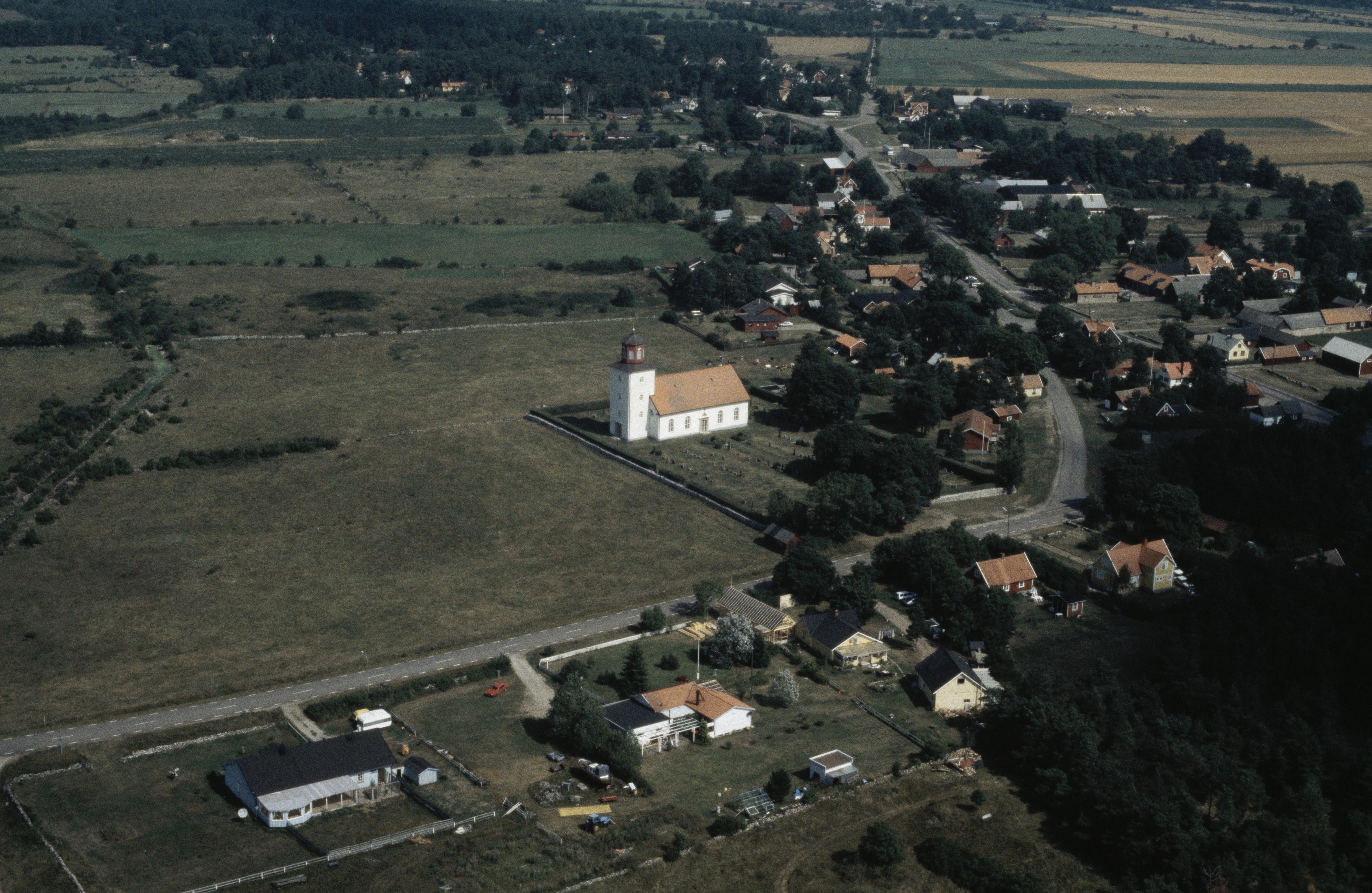 Beskrivning: Alvaret, norra delen. Gårdby kyrka och kyrkby. Bilden är tagen mot (väderstreck): NO