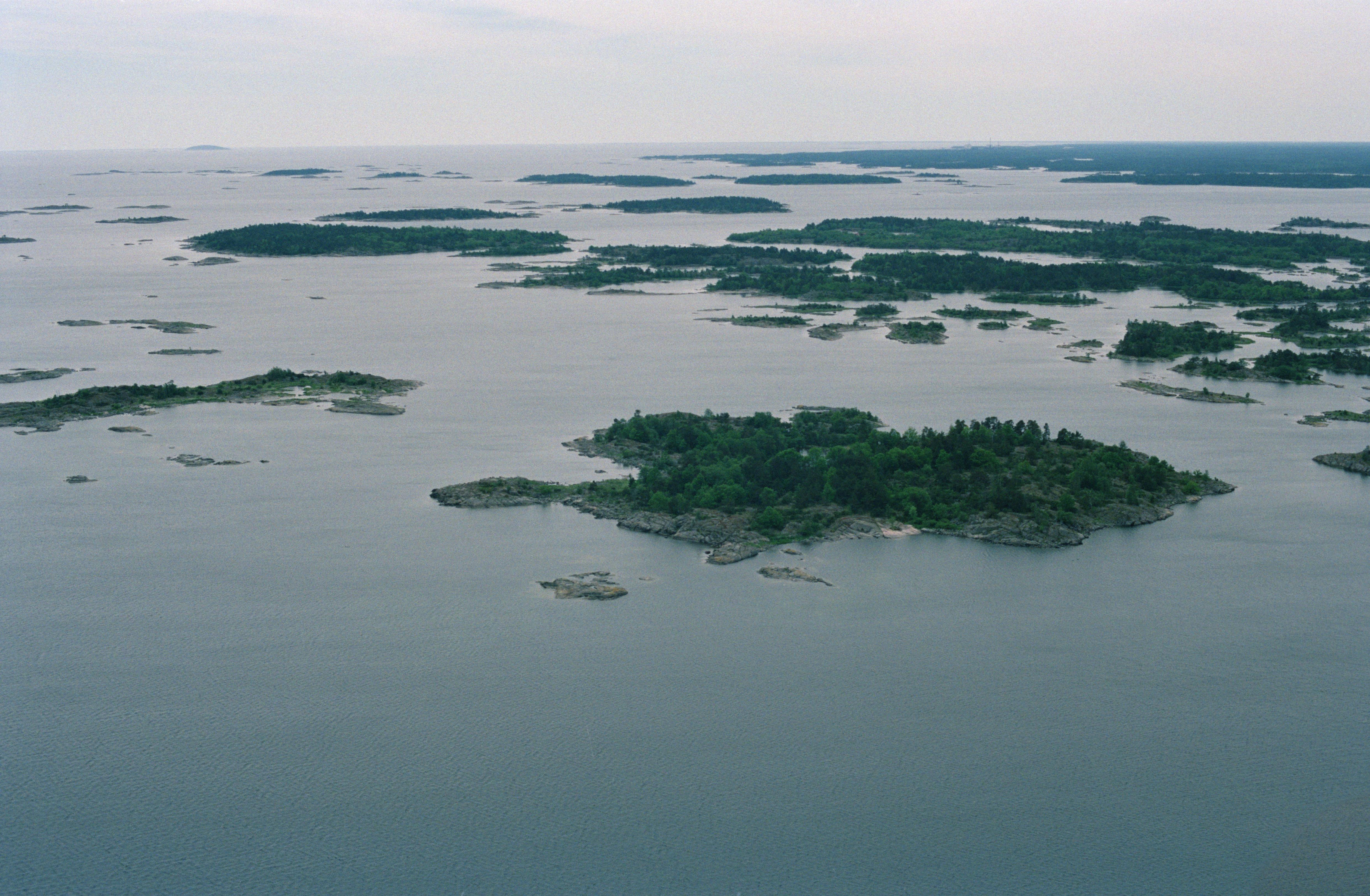 Beskrivning: Misterhults skärgård. Stora Korsholmen vid bildens mitt. Tomtning och kanal RAÄnr Misterhult 1684:1 och 1684:1. Bilden är tagen mot (väderstreck): S