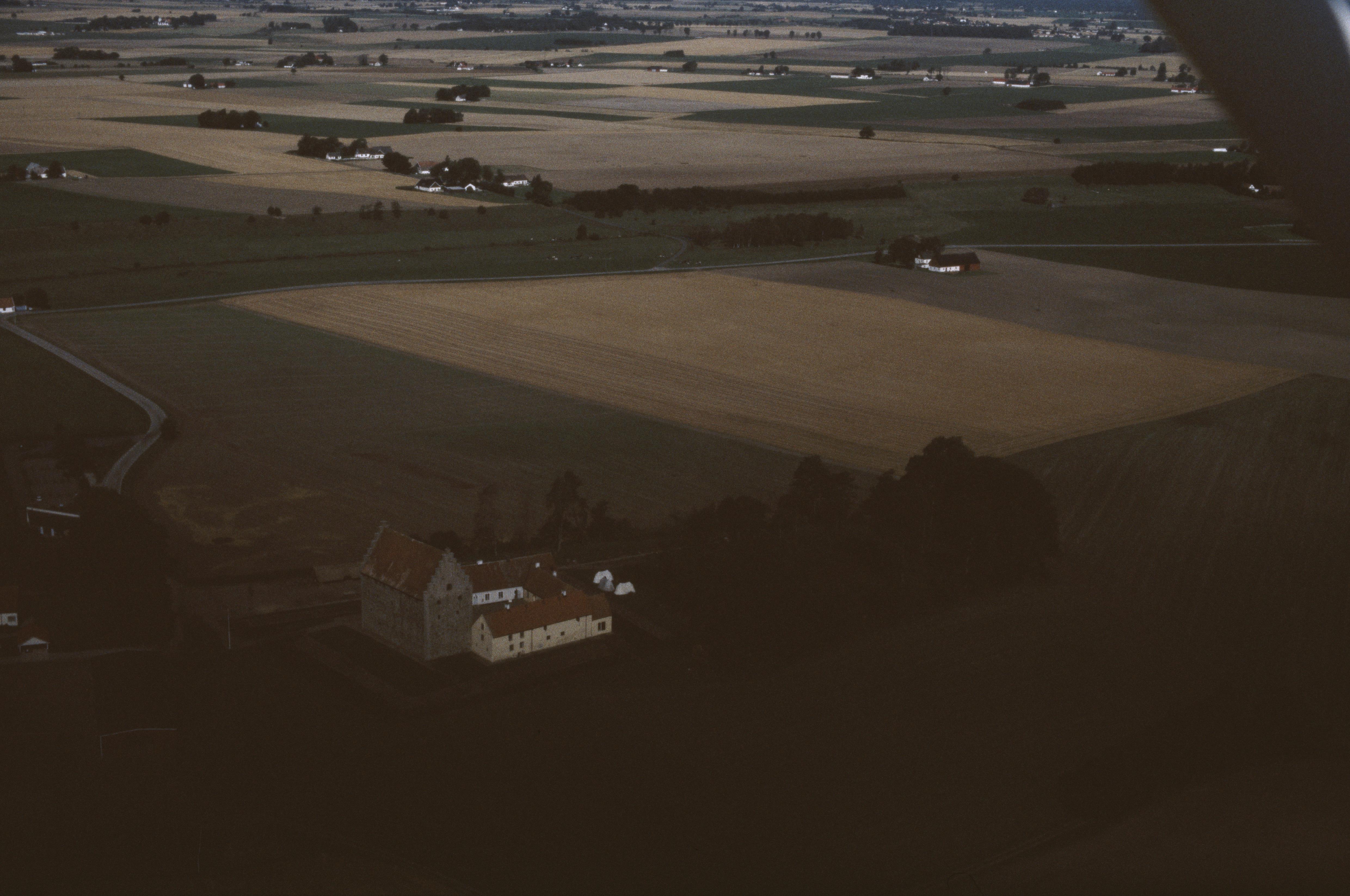 Beskrivning: Glimmingehus borg RAÄnr Vallby 5:1 i kvällsljus. (NB! Bilden är mycket mörk och har en motivskada uppe i högra hörnet). Bilden är tagen mot (väderstreck): NV