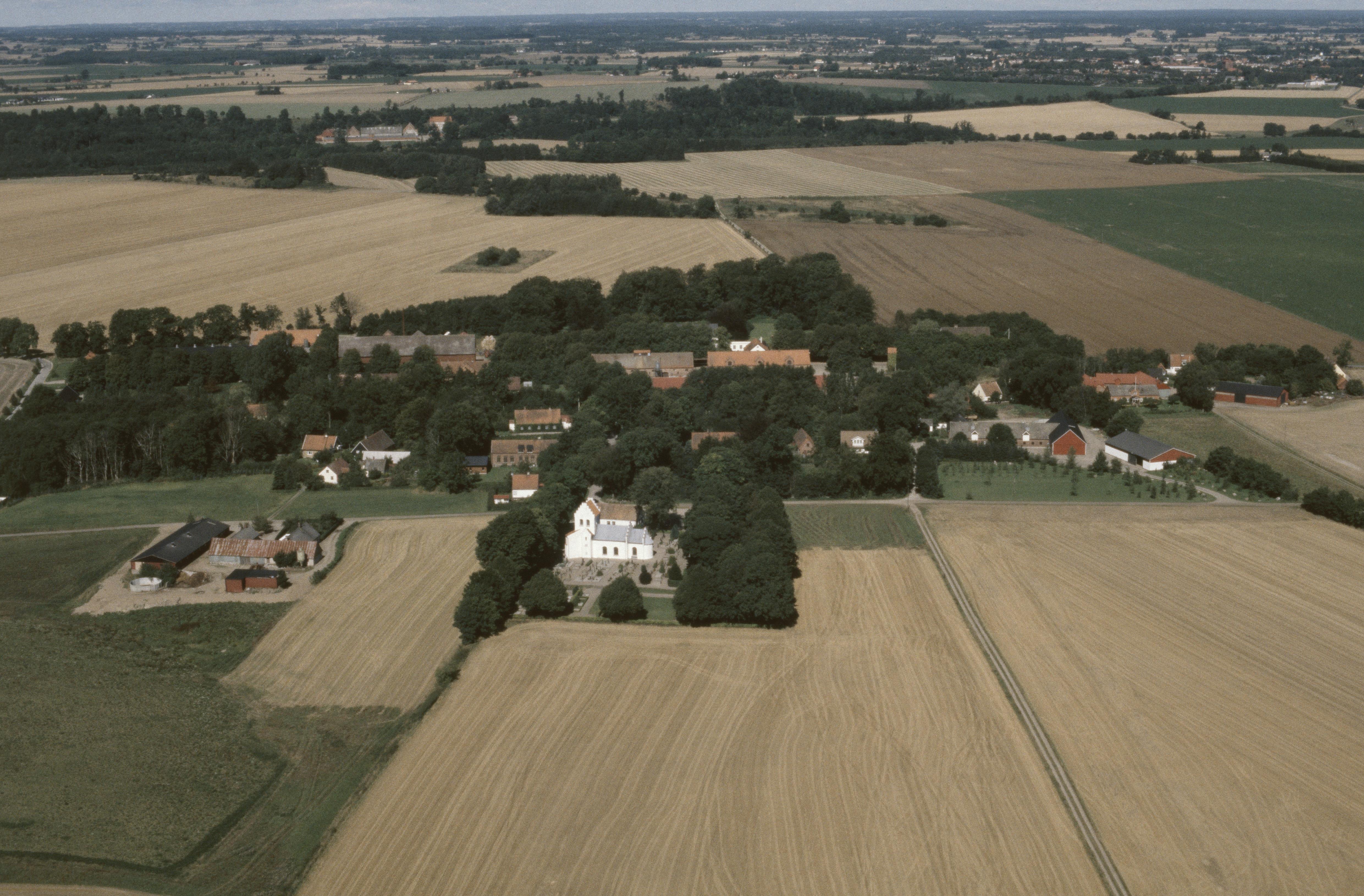 Beskrivning: Övraby kyrka. I bildens övre del herrgården Övrabyborg. Bilden är tagen mot (väderstreck): N