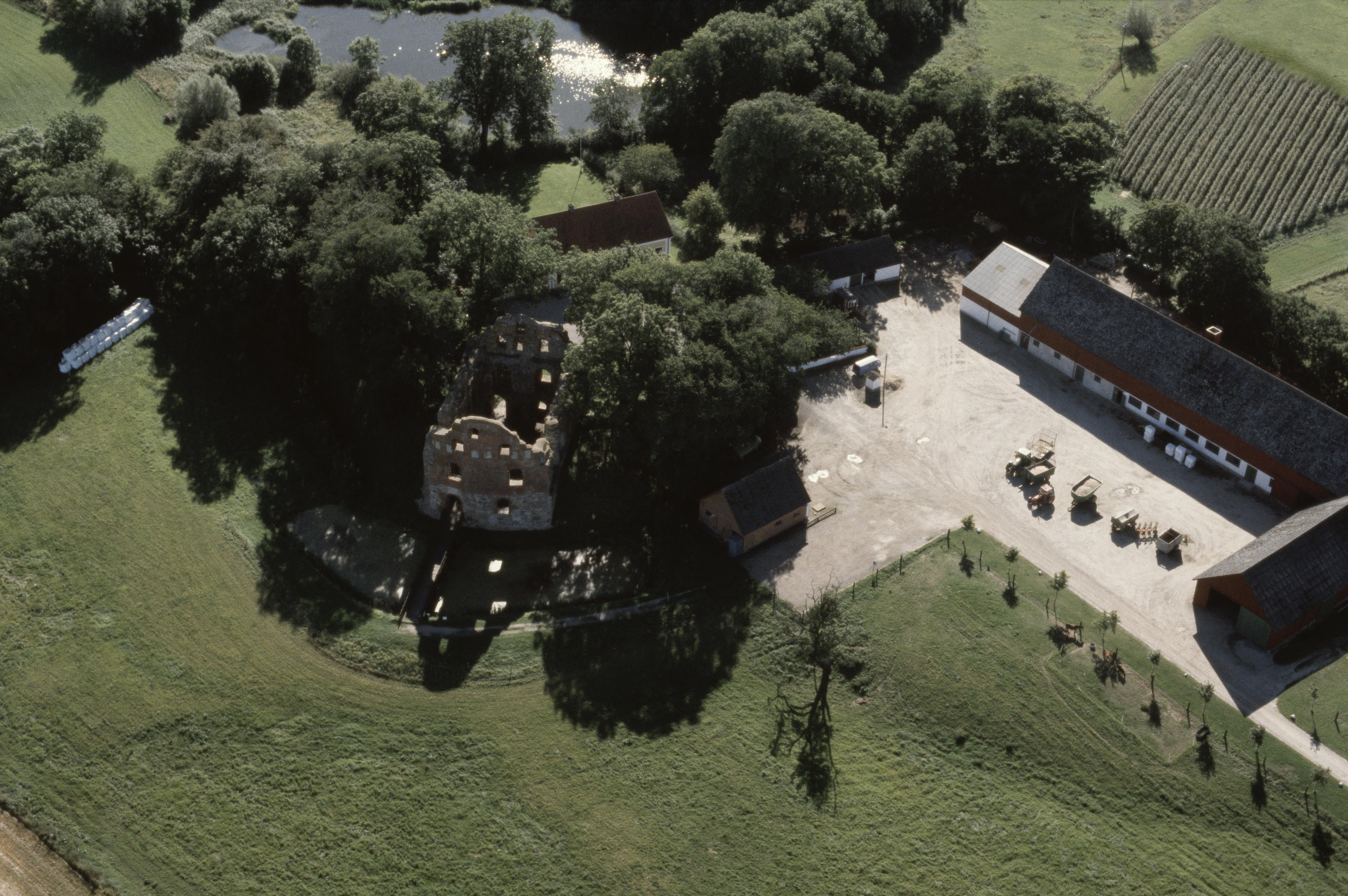 Beskrivning: Månstorps kungsgård / Månstorps herrgård och slottsruinen Månstorps gavlar RAÄnr Västra Ingelstad 1:1. I bildens övre del Östra Grevie socken. Bilden är tagen mot (väderstreck): SV