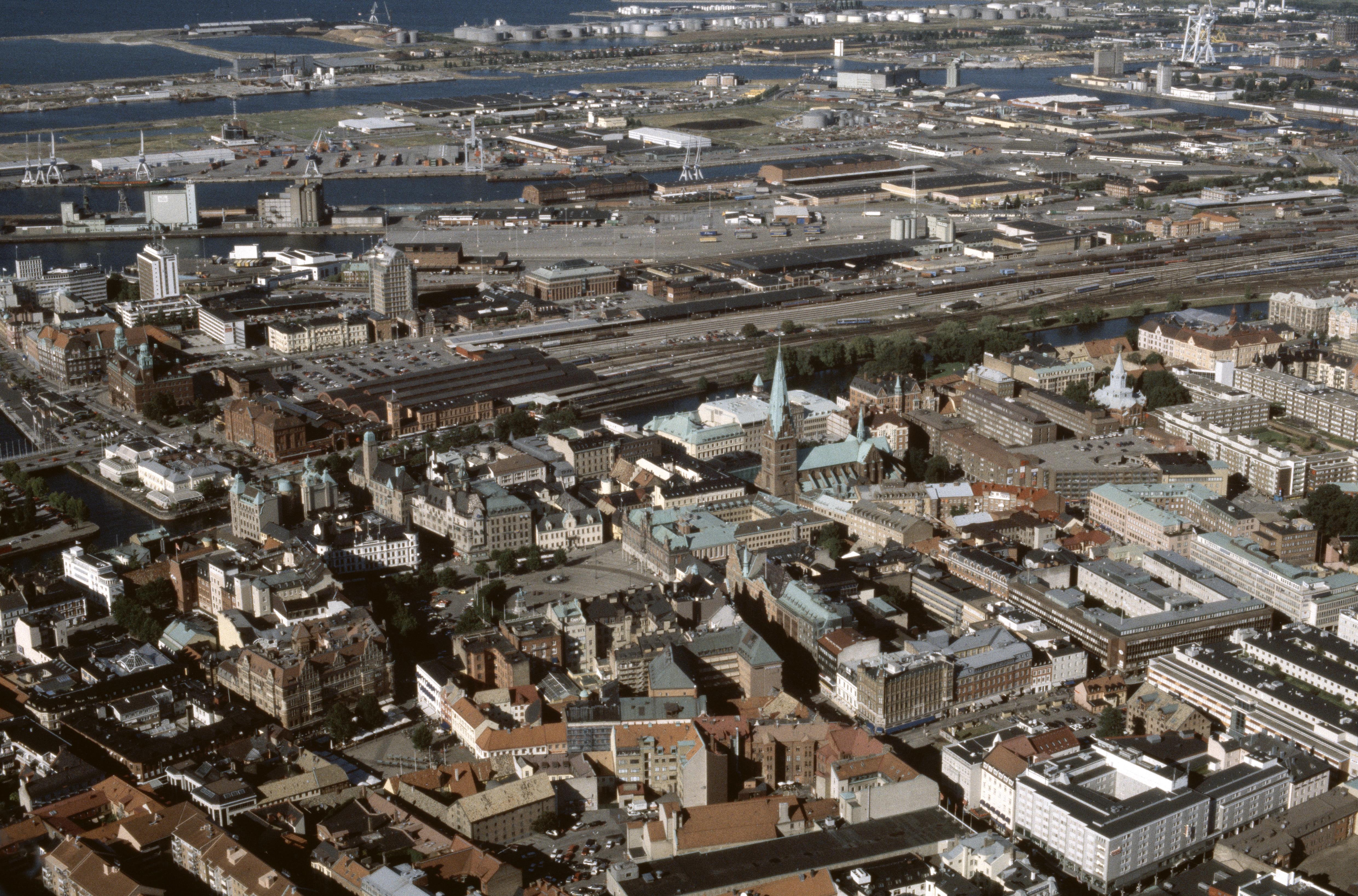 Beskrivning: Malmö stad. Malmö centralstation, Hamnkanalen, Gamla staden med Stortorget och Sankt Petri kyrka. Bilden är tagen mot (väderstreck): N