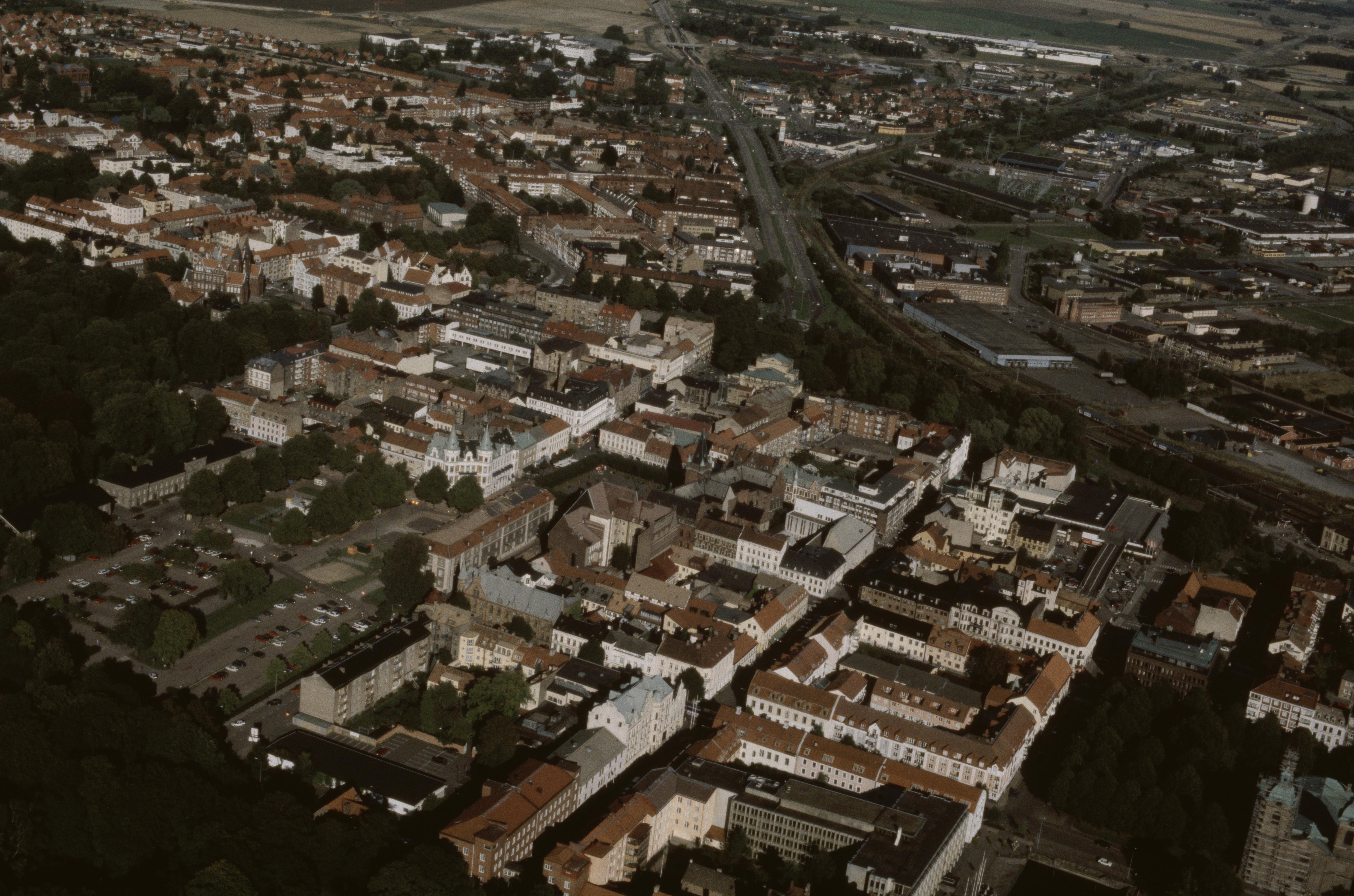 Beskrivning: Landskrona stad. Rådhustorget vid bildens mitt. Bilden är tagen mot (väderstreck): NO