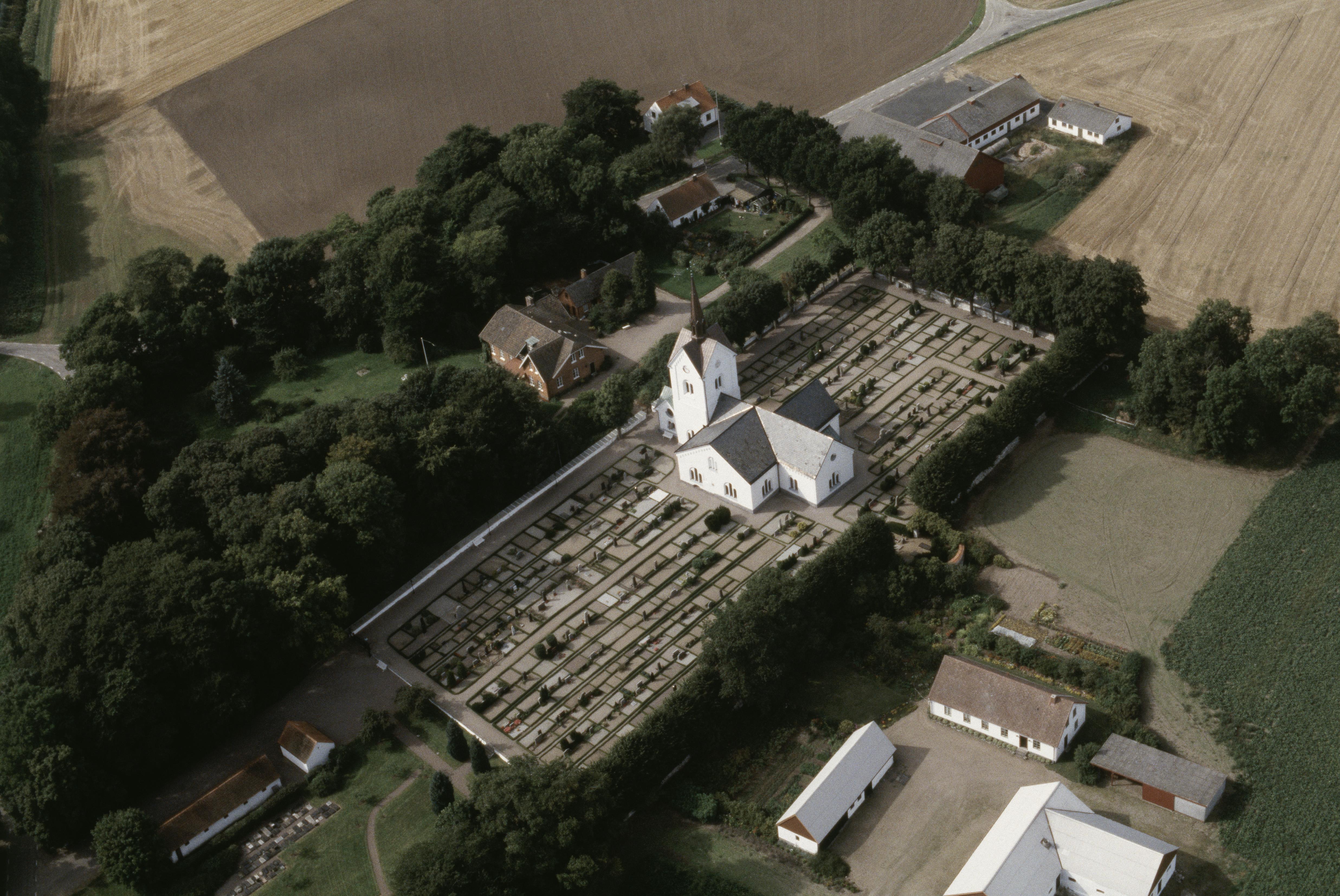 Beskrivning: Östra Vemmenhögs kyrka. Uppe till höger högen Väpmannahög RAÄnr Östra Vemmenhög 2:1. Bilden är tagen mot (väderstreck): NV