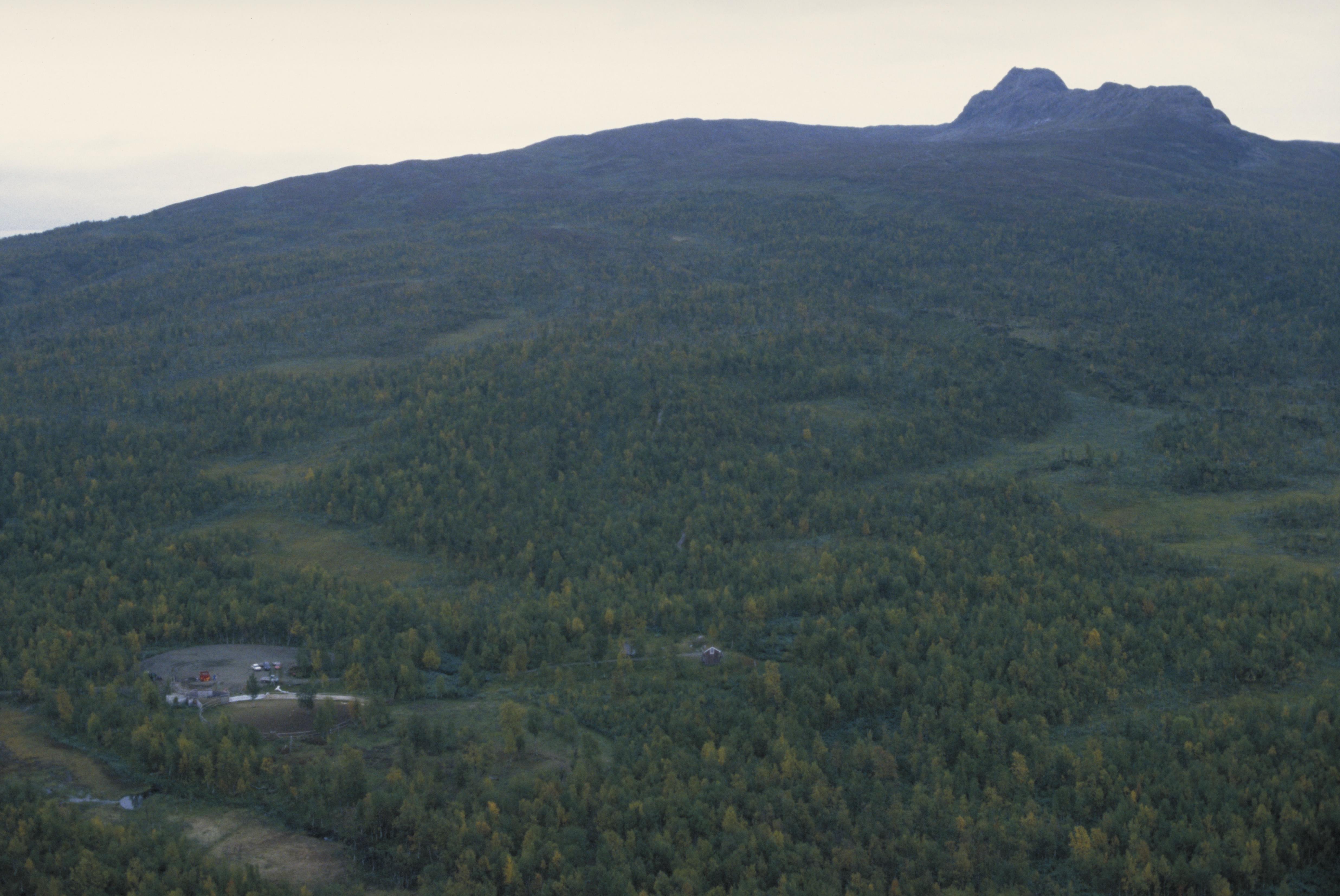Samisk kulturmiljö: Heliga berget Atoklinten och Atostugan - en timmerstuga inom området för Vapstens sameby. Bilden är tagen mot (väderstreck): Ö